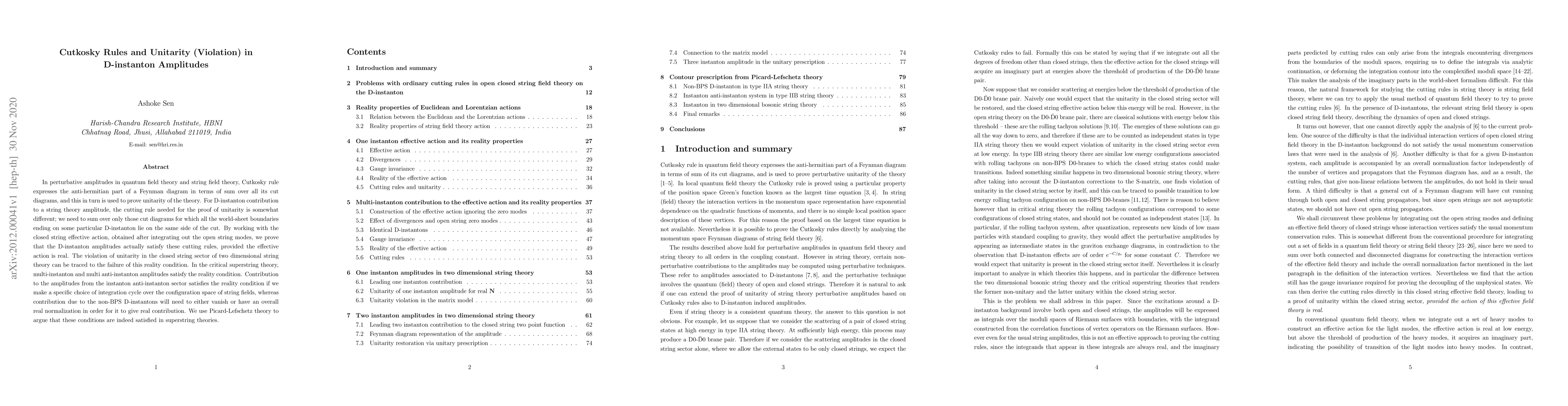 This paper investigates the application of Cutkosky rules to D-instanton amplitudes in string theory, demonstrating that unitarity is upheld when the effective action is real. It reveals that unitarity violations in two-dimensional string theory arise from the failure of this reality condition, particularly for non-BPS D-instanton contributions.