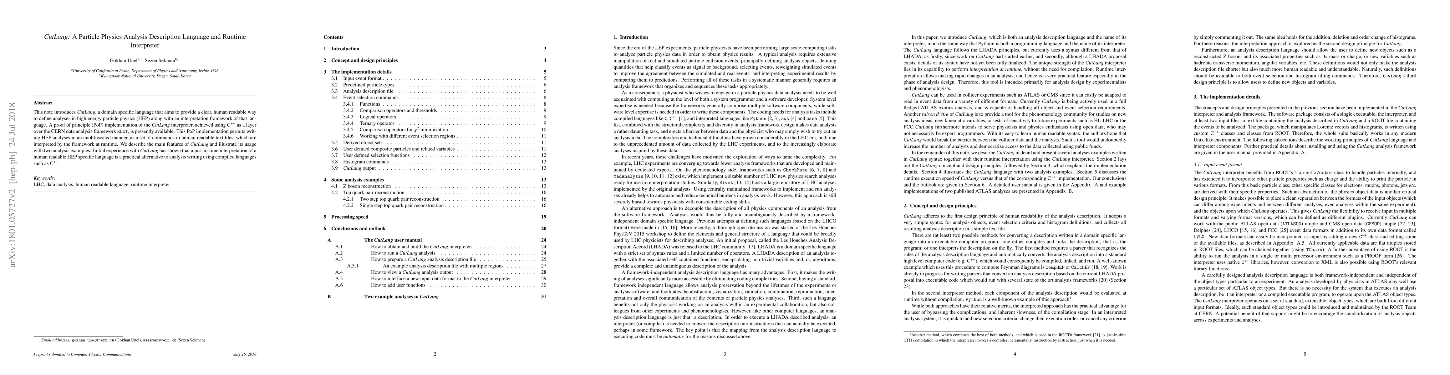 CutLang is a domain-specific language designed for high-energy particle physics analyses, allowing researchers to define analyses in clear, human-readable text files interpreted at runtime. The proof-of-concept implementation in C++ over the ROOT framework demonstrates its practical viability as an alternative to compiled languages like C++.