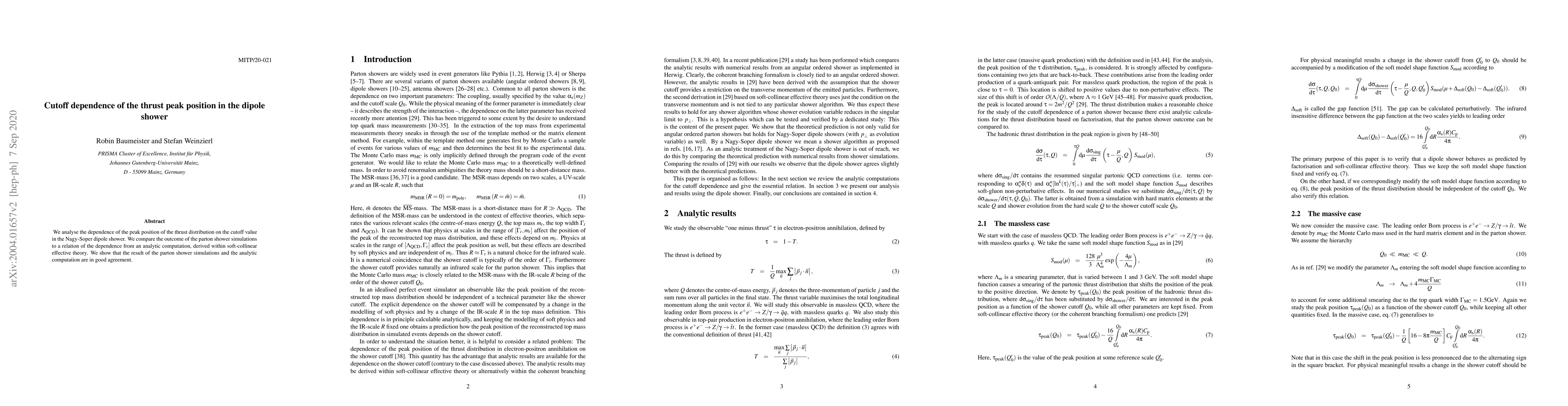 This research analyzes how the peak of the thrust distribution changes with the cutoff in the Nagy-Soper dipole shower, comparing simulation results with an analytic computation from soft-collinear effective theory. The findings show good agreement between the two methods.