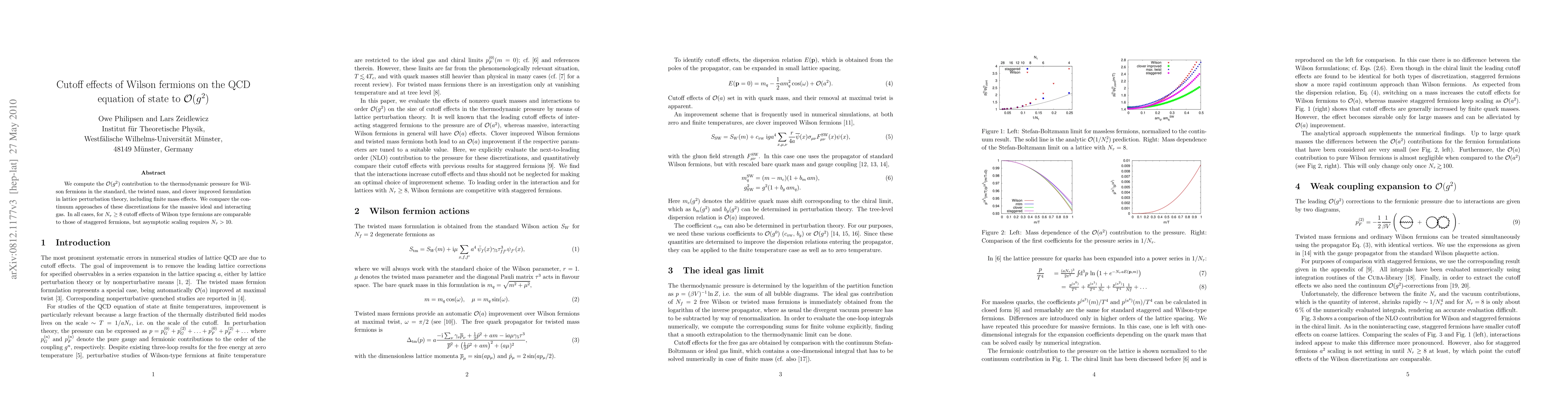 This study calculates the O(g^2) contribution to the thermodynamic pressure for Wilson fermions in various formulations, comparing them with staggered fermions. Results show comparable cutoff effects for N_t ≥ 8, but asymptotic scaling necessitates $N_\tau > 10$.