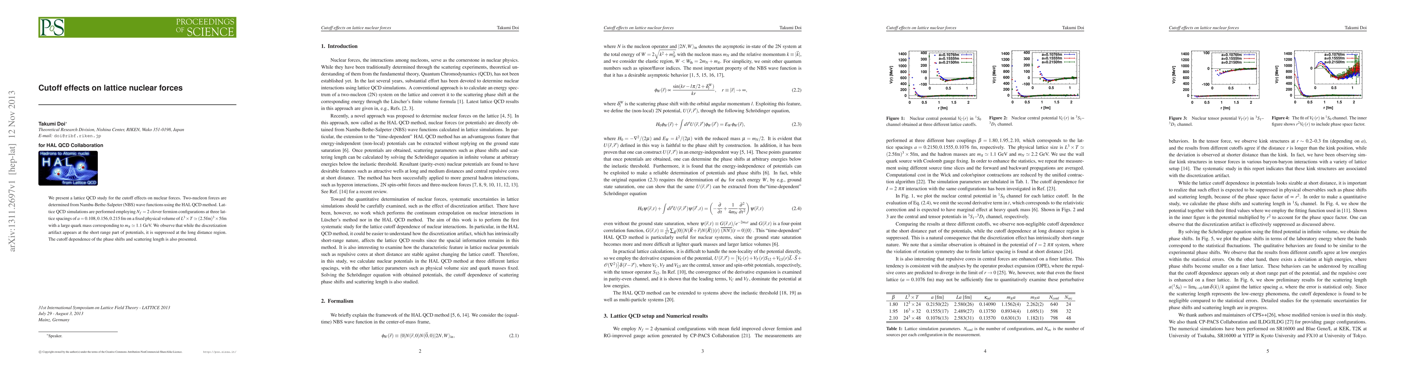 This study investigates cutoff effects in lattice QCD simulations on nuclear forces, using Nambu-Bethe-Salpeter wave functions and the HAL QCD method. It finds that discretization artifacts affect short-range potentials but diminish at longer distances, and reports the cutoff dependence of phase shifts and scattering lengths.