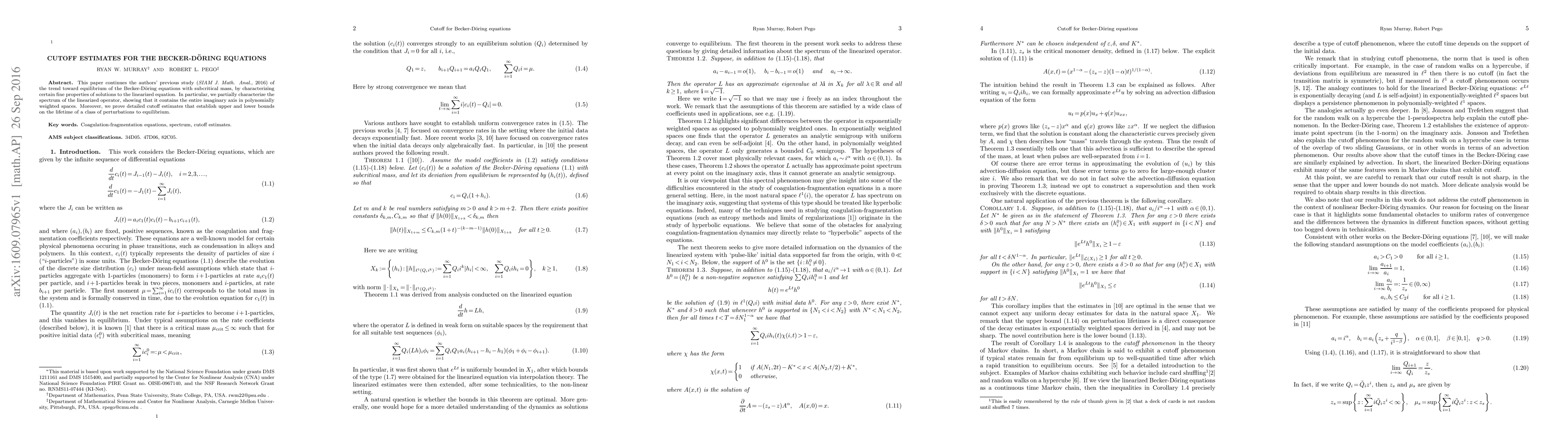 This paper investigates the equilibrium behavior of the Becker-Döring equations, characterizing the spectrum of the linearized operator and proving detailed cutoff estimates to establish bounds on the lifetime of perturbations to equilibrium.