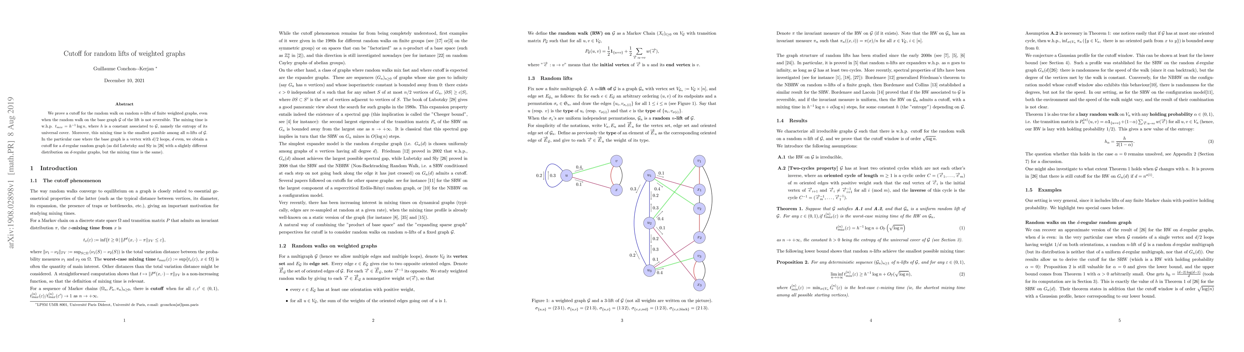 We prove a cutoff for the random walk on random $n$-lifts of finite weighted graphs, even when the random walk on the base graph $\mathcal{G}$ of the lift is not reversible. The mixing time is w.h.p. $t_{mix}=h^{-1}\log n$, where $h$ is a constant associated to $\mathcal{G}$, namely the entropy of its universal cover. Moreover, this mixing time is the smallest possible among all $n$-lifts of $\mathcal{G}$. In the particular case where the base graph is a vertex with $d/2$ loops, $d$ even, we obtain a cutoff for a $d$-regular random graph (as did Lubetzky and Sly in \cite{cutoffregular} with a slightly different distribution on $d$-regular graphs, but the mixing time is the same).