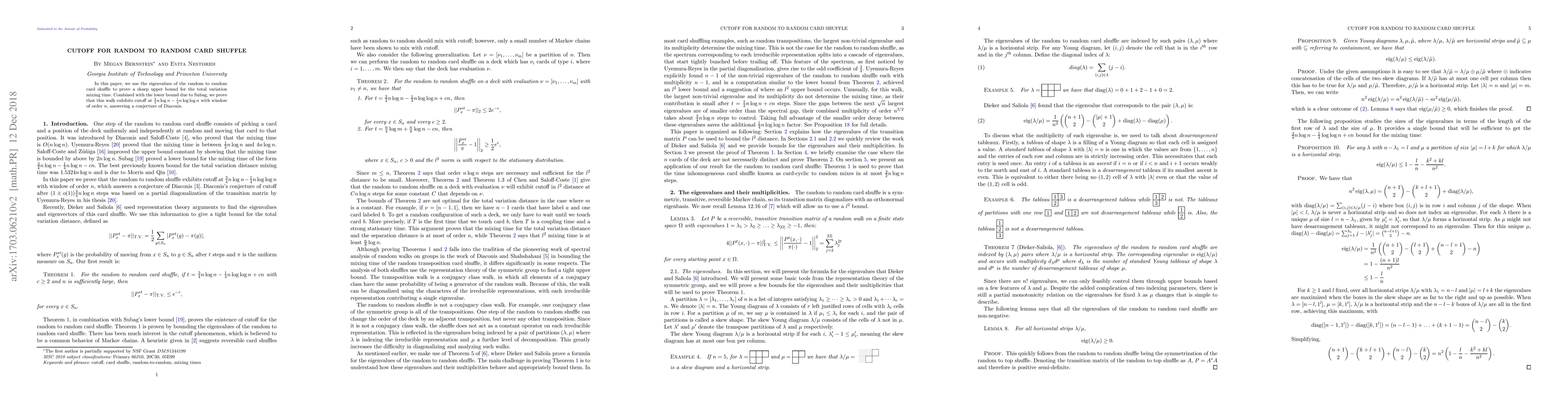 This paper establishes a sharp upper bound for the total variation mixing time in random to random card shuffles using eigenvalues, confirming cutoff behavior at $\frac{3}{4} n \log n - \frac{1}{4}n\log\log{n}$ and validating a conjecture by Diaconis.