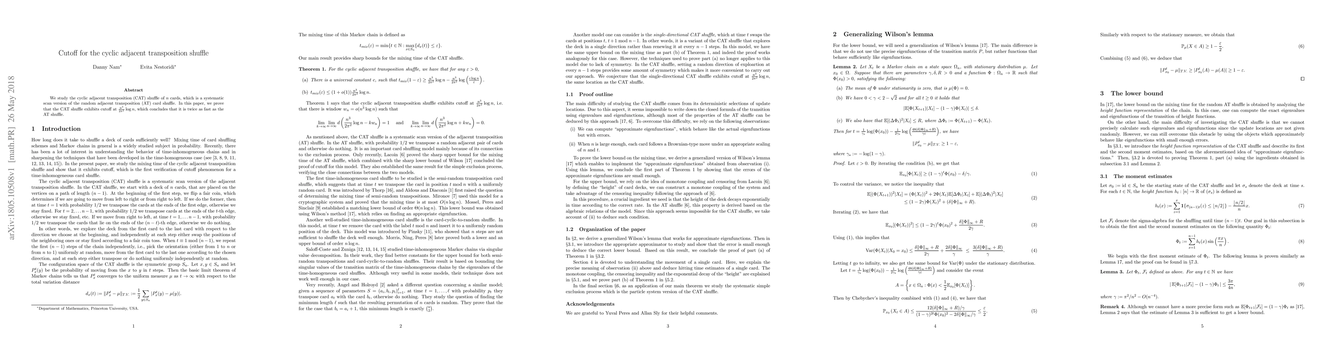 The cyclic adjacent transposition (CAT) shuffle of $n$ cards converges rapidly to randomness at $\frac{n^3}{2 \pi^2} \log n$, demonstrating cutoff and proving it is twice as fast as the random adjacent transposition (AT) shuffle.