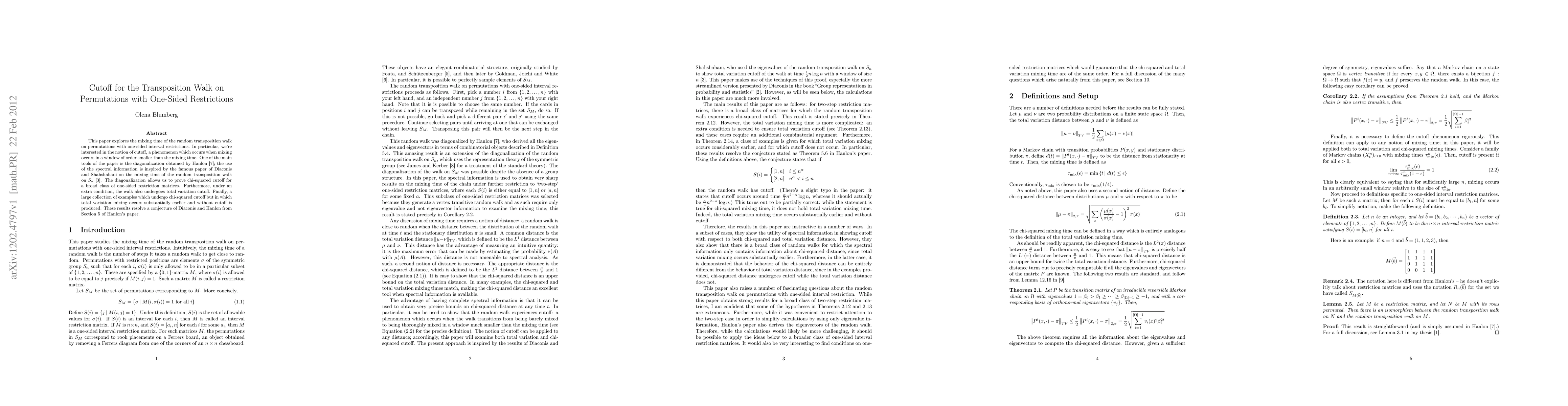 This paper investigates the mixing time of the random transposition walk on permutations with one-sided interval restrictions, proving chi-squared cutoff for a broad class of these restrictions and total variation cutoff under additional conditions, thus resolving a conjecture by Diaconis and Hanlon.