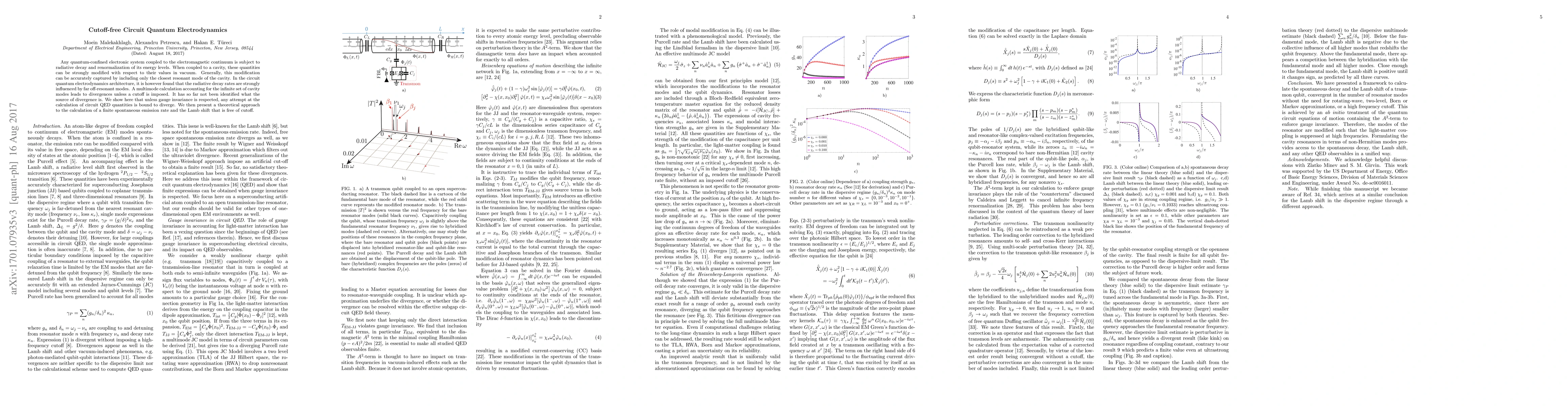 Any quantum-confined electronic system coupled to the electromagnetic continuum is subject to radiative decay and renormalization of its energy levels. When coupled to a cavity, these quantities can be strongly modified with respect to their values in vacuum. Generally, this modification can be accurately captured by including only the closest resonant mode of the cavity. In the circuit quantum electrodynamics architecture, where the coupling strengths can be substantial, it is however found that the radiative decay rates are strongly influenced by far off-resonant modes. A multimode calculation accounting for the infinite set of cavity modes leads to divergences unless a cutoff is imposed. It has so far not been identified what the source of divergence is. We show here that unless gauge invariance is respected, any attempt at the calculation of circuit QED quantities is bound to diverge. We then present a theoretical approach to the calculation of a finite spontaneous emission rate and the Lamb shift that is free of cutoff.
