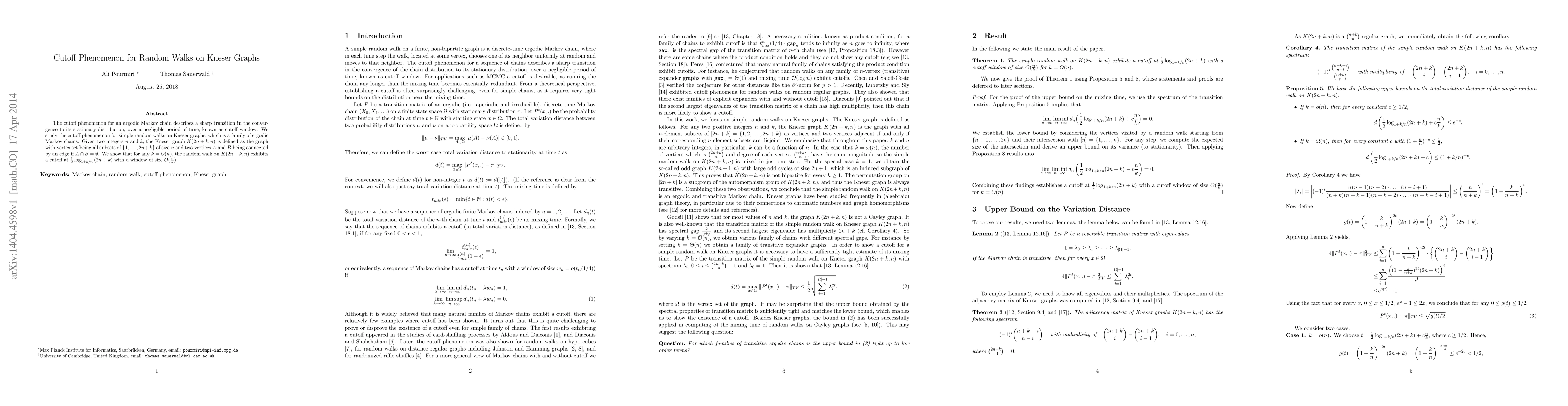 The paper provides a detailed proof of the cutoff phenomenon for random walks on Kneser graphs, including upper and lower bounds on the total variation distance.