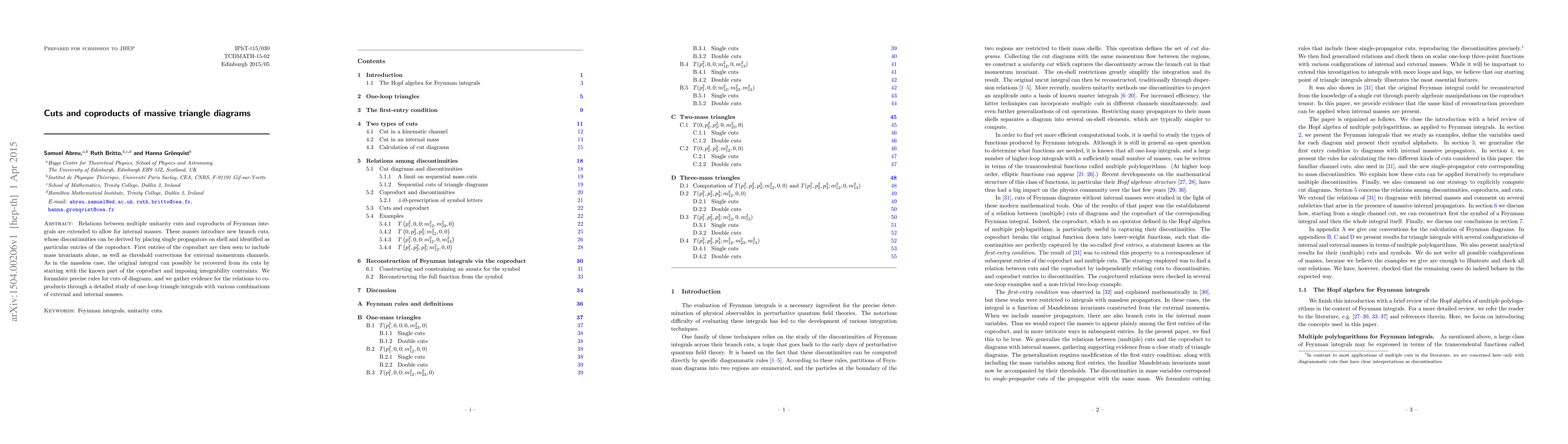 Relations between multiple unitarity cuts and coproducts of Feynman integrals are extended to allow for internal masses. These masses introduce new branch cuts, whose discontinuities can be derived by placing single propagators on shell and identified as particular entries of the coproduct. First entries of the coproduct are then seen to include mass invariants alone, as well as threshold corrections for external momentum channels. As in the massless case, the original integral can possibly be recovered from its cuts by starting with the known part of the coproduct and imposing integrability contraints. We formulate precise rules for cuts of diagrams, and we gather evidence for the relations to coproducts through a detailed study of one-loop triangle integrals with various combinations of external and internal masses.