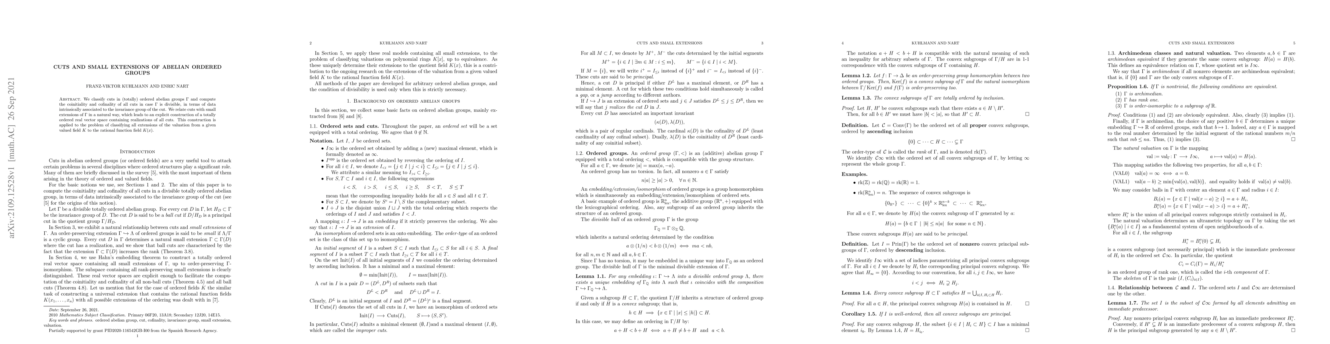 This paper classifies cuts in totally ordered abelian groups, computes their coinitiality and cofinality when the group is divisible, and connects these cuts with small extensions, leading to a construction of a vector space containing all such cuts. It applies this construction to classify extensions of a valuation to a rational function field.