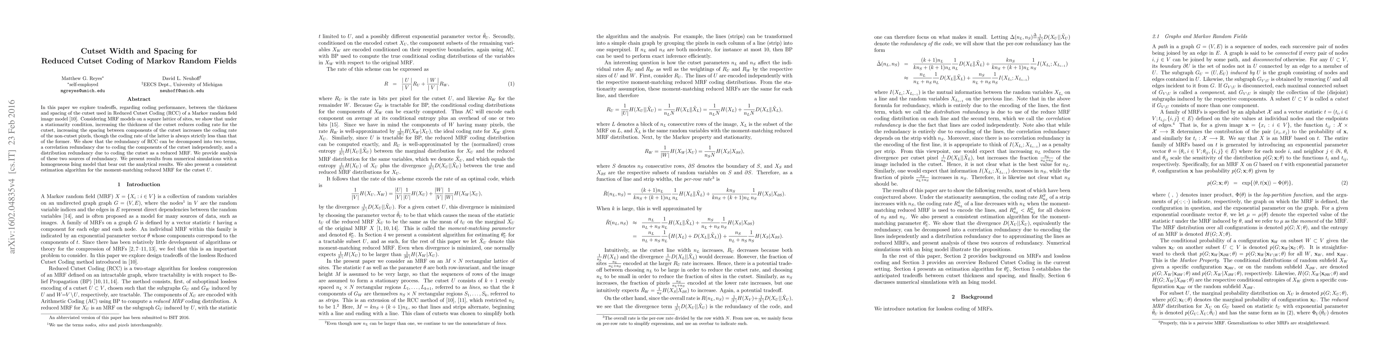 In this paper we explore tradeoffs, regarding coding performance, between the thickness and spacing of the cutset used in Reduced Cutset Coding (RCC) of a Markov random field image model. Considering MRF models on a square lattice of sites, we show that under a stationarity condition, increasing the thickness of the cutset reduces coding rate for the cutset, increasing the spacing between components of the cutset increases the coding rate of the non-cutset pixels, though the coding rate of the latter is always strictly less than that of the former. We show that the redundancy of RCC can be decomposed into two terms, a correlation redundancy due to coding the components of the cutset independently, and a distribution redundancy due to coding the cutset as a reduced MRF. We provide analysis of these two sources of redundancy. We present results from numerical simulations with a homogeneous Ising model that bear out the analytical results. We also present a consistent estimation algorithm for the moment-matching reduced MRF on the cutset.