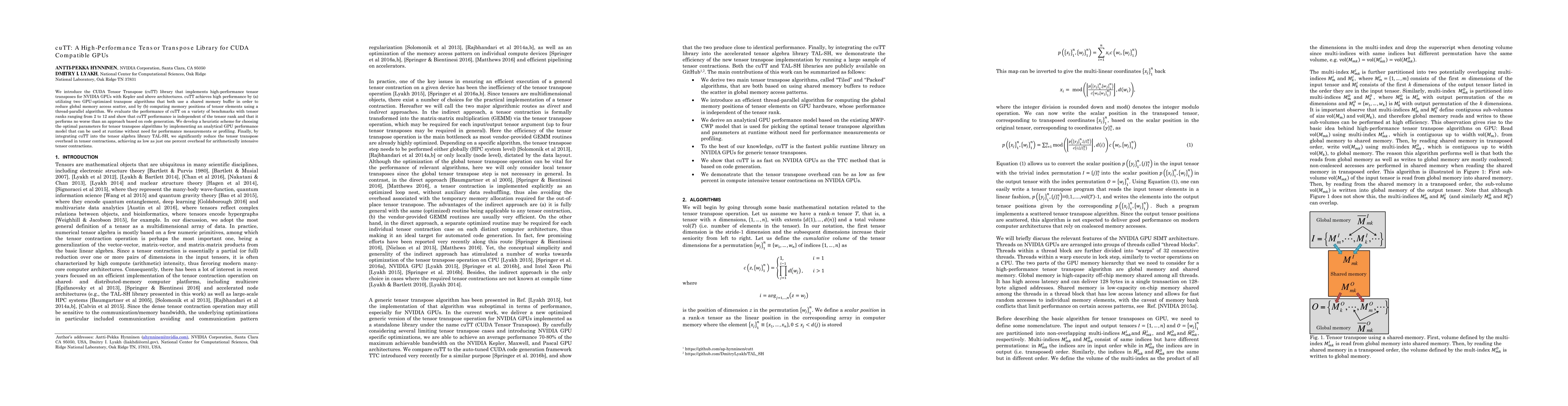 The cuTT library provides high-performance tensor transpose algorithms for CUDA-compatible GPUs, utilizing GPU-optimized algorithms and a thread-parallel memory positioning scheme to minimize global memory access. It achieves comparable performance to code generation methods and integrates seamlessly into tensor algebra libraries to reduce overhead in tensor contractions.