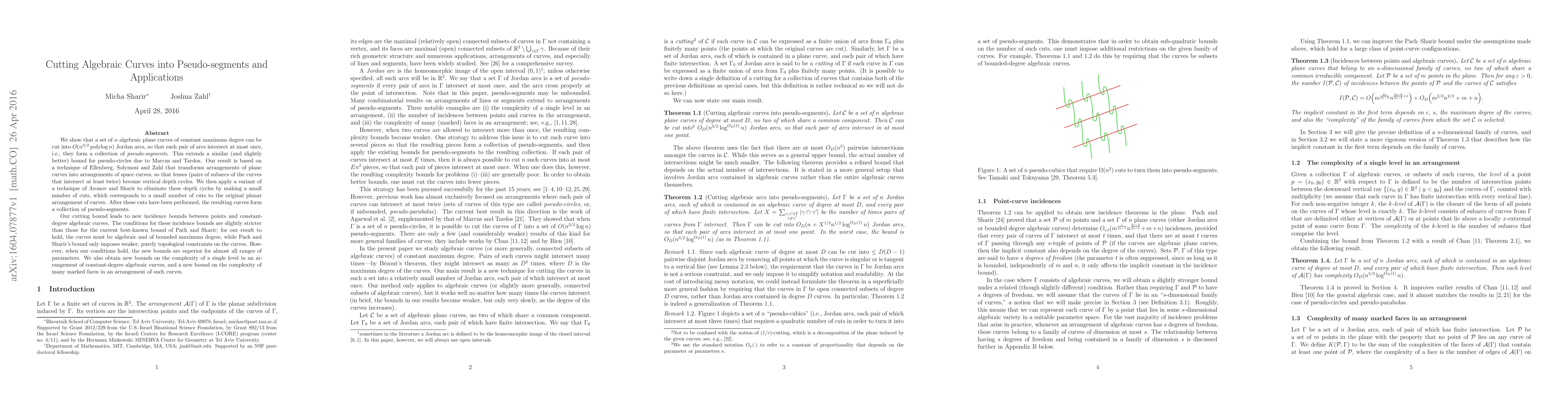 We show that a set of $n$ algebraic plane curves of constant maximum degree can be cut into $O(n^{3/2}\operatorname{polylog} n)$ Jordan arcs, so that each pair of arcs intersect at most once, i.e., they form a collection of pseudo-segments. This extends a similar (and slightly better) bound for pseudo-circles due to Marcus and Tardos. Our result is based on a technique of Ellenberg, Solymosi and Zahl that transforms arrangements of plane curves into arrangements of space curves, so that lenses (pairs of subarcs of the curves that intersect at least twice) become vertical depth cycles. We then apply a variant of a technique of Aronov and Sharir to eliminate these depth cycles by making a small number of cuts, which corresponds to a small number of cuts to the original planar arrangement of curves. After these cuts have been performed, the resulting curves form a collection of pseudo-segments. Our cutting bound leads to new incidence bounds between points and constant-degree algebraic curves. The conditions for these incidence bounds are slightly stricter than those for the current best-known bound of Pach and Sharir; for our result to hold, the curves must be algebraic and of bounded maximum degree, while Pach and Sharir's bound only imposes weaker, purely topological constraints on the curves. However, when our conditions hold, the new bounds are superior for almost all ranges of parameters. We also obtain new bounds on the complexity of a single level in an arrangement of constant-degree algebraic curves, and a new bound on the complexity of many marked faces in an arrangement of such curves.