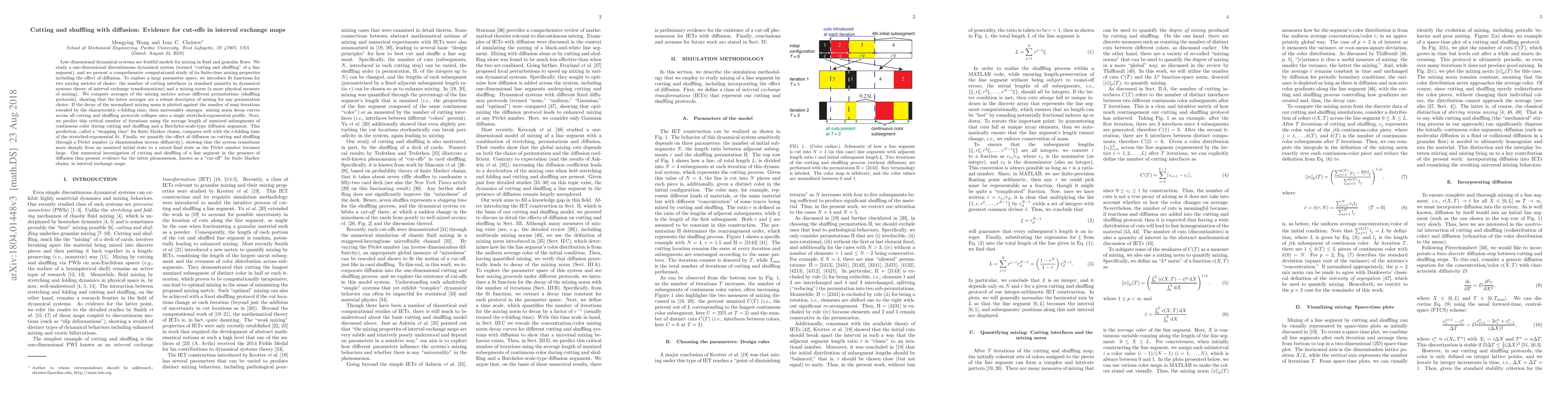 Low-dimensional dynamical systems are fruitful models for mixing in fluid and granular flows. We study a one-dimensional discontinuous dynamical system (termed "cutting and shuffling" of a line segment), and we present a comprehensive computational study of its finite-time mixing properties including the effect of diffusion. To explore a large parameter space, we introduce fit functions for two mixing metrics of choice: the number of cutting interfaces (a standard quantity in dynamical systems theory of interval exchange transformations) and a mixing norm (a more physical measure of mixing). We compute averages of the mixing metrics across different permutations (shuffling protocols), showing that the latter averages are a robust descriptor of mixing for any permutation choice. If the decay of the normalized mixing norm is plotted against the number of map iterations rescaled by the characteristic e-folding time, then universality emerges: mixing norm decay curves across all cutting and shuffling protocols collapse onto a single stretched-exponential profile. Next, we predict this critical number of iterations using the average length of unmixed subsegments of continuous color during cutting and shuffling and a Batchelor-scale-type diffusion argument. This prediction, called a "stopping time" for finite Markov chains, compares well with the e-folding time of the stretched-exponential fit. Finally, we quantify the effect of diffusion on cutting and shuffling through a P\'eclet number (a dimensionless inverse diffusivity), showing that the system transitions more sharply from an unmixed initial state to a mixed final state as the P\'eclet number becomes large. Our numerical investigation of cutting and shuffling of a line segment in the presence of diffusion thus present evidence for the latter phenomenon, known as a "cut-off" for finite Markov chains, in interval exchange maps.