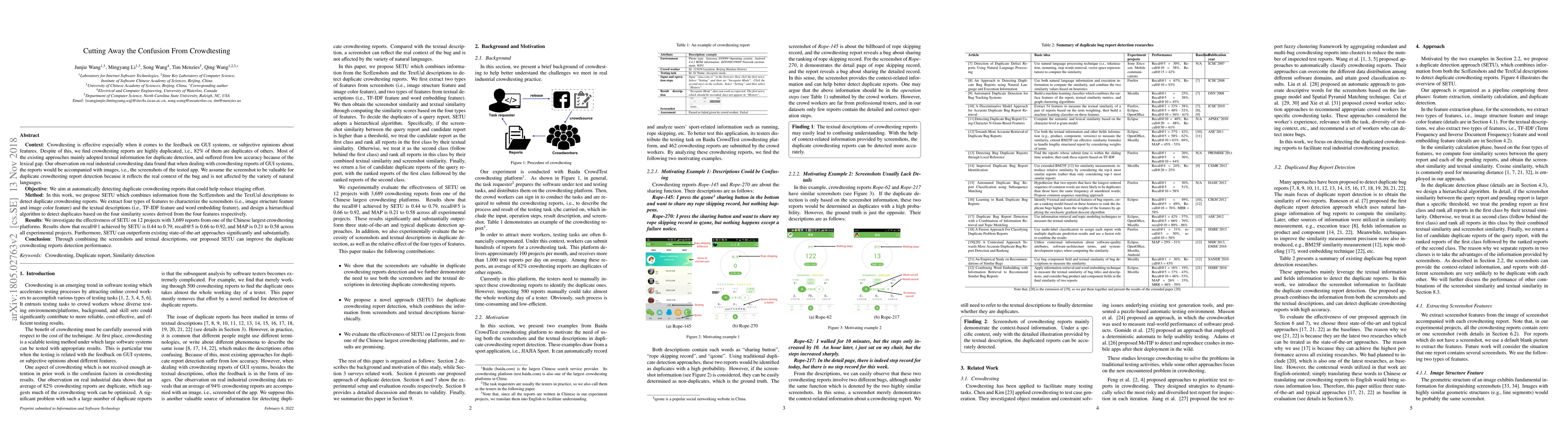 Crowdtesting is effective especially when it comes to the feedback on GUI systems, or subjective opinions about features. Despite of this, we find crowdtesting reports are highly replicated, i.e., 82% of them are replicates of others. Hence automatically detecting replicate reports could help reduce triaging efforts. Most of the existing approaches mainly adopted textual information for replicate detection, and suffered from low accuracy because of the expression gap. Our observation on real industrial crowdtesting data found that when dealing with crowdtesting reports of GUI systems, the reports would accompanied with images, i.e., the screenshots of the app. We assume the screenshot to be valuable for replicate crowdtesting report detection because it reflects the real scenario of the failure and is not affected by the variety of natural languages. In this work, we propose a replicate detection approach, TSDetector, which combines information from the screenshots and the textual descriptions to detect replicate crowdtesting reports. We extract four types of features to characterize the screenshots and the textual descriptions, and design an algorithm to detect replicates based on four similarity scores derived from the four different features respectively. We investigate the effectiveness and advantage of TSDetector on 15 commercial projects with 4,172 reports from one of the Chinese largest crowdtesting platforms.Results show that TSDetector can outperform existing state-of-the-art approaches significantly. In addition, we also evaluate its usefulness using real-world case studies. The feedback from real-world testers demonstrates its practical value