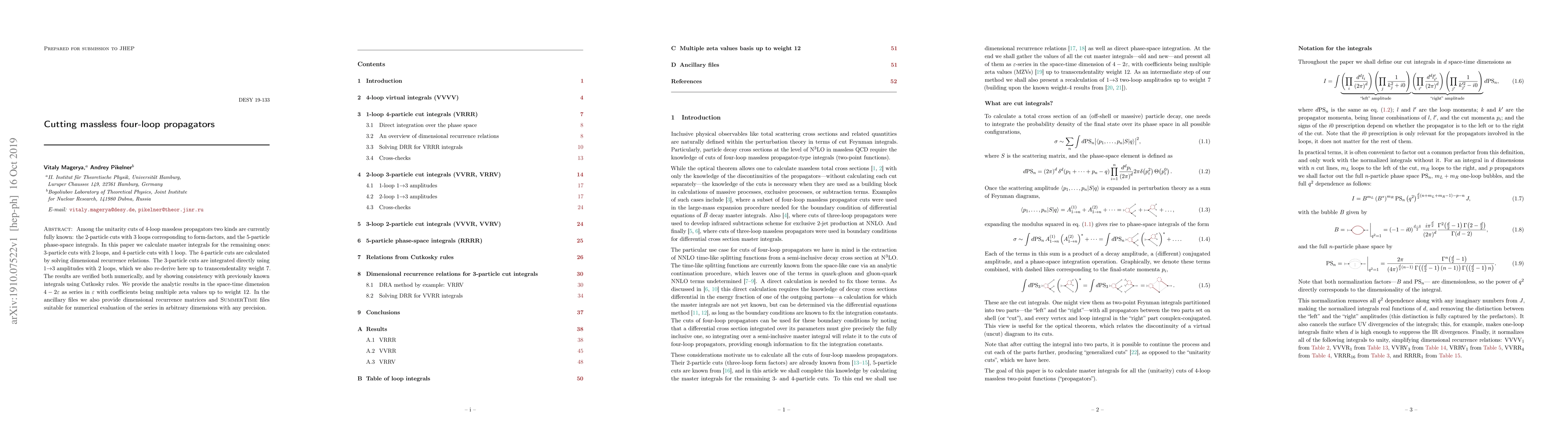 Among the unitarity cuts of 4-loop massless propagators two kinds are currently fully known: the 2-particle cuts with 3 loops corresponding to form-factors, and the 5-particle phase-space integrals. In this paper we calculate master integrals for the remaining ones: 3-particle cuts with 2 loops, and 4-particle cuts with 1 loop. The 4-particle cuts are calculated by solving dimensional recurrence relations. The 3-particle cuts are integrated directly using 1->3 amplitudes with 2 loops, which we also re-derive here up to transcendentality weight 7. The results are verified both numerically, and by showing consistency with previously known integrals using Cutkosky rules. We provide the analytic results in the space-time dimension 4-2{\epsilon} as series in {\epsilon} with coefficients being multiple zeta values up to weight 12. In the ancillary files we also provide dimensional recurrence matrices and SummerTime files suitable for numerical evaluation of the series in arbitrary dimensions with any precision.