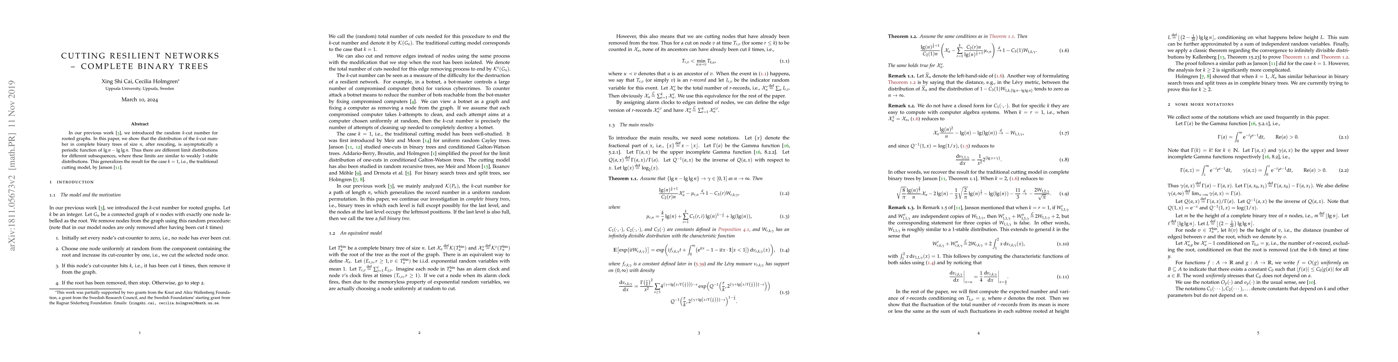 The paper shows that in complete binary trees of size n, the distribution of the k-cut number is asymptotically a periodic function of πg n - πg lg n, generalizing previous results on the traditional cutting model.