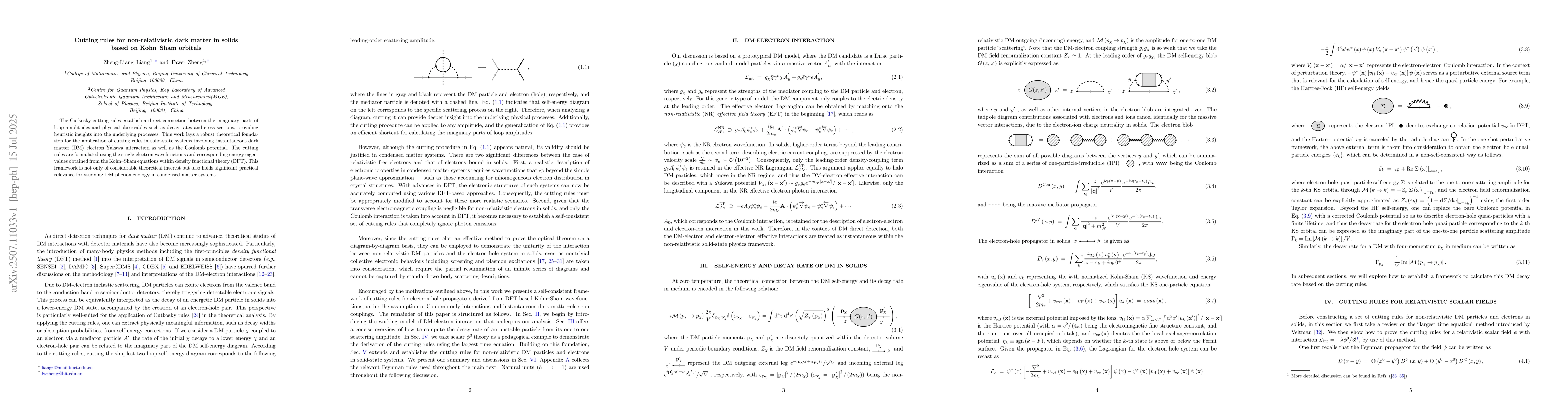 The research establishes cutting rules for non-relativistic dark matter (DM) in solids using Kohn-Sham orbitals, extending Cutkosky cutting rules from relativistic scalar fields to solid-state systems with DM-electron Yukawa interaction and Coulomb potential within density functional theory (DFT).