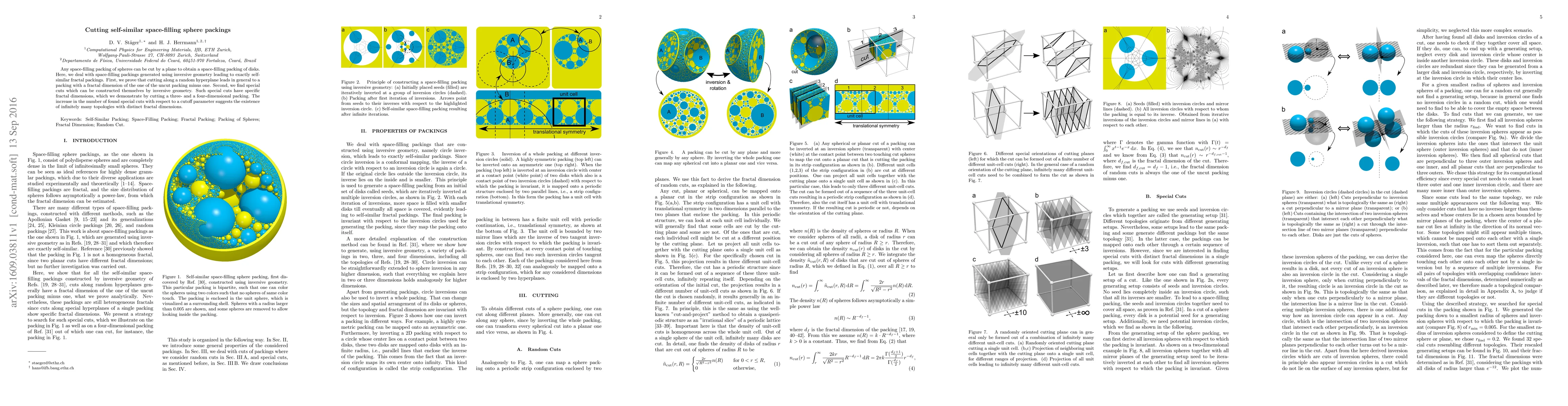 This paper investigates space-filling sphere packings transformed by cutting with planes, focusing on self-similar fractal packings generated via inversive geometry. It proves that random cuts reduce the fractal dimension by one and identifies special cuts with distinct fractal dimensions, suggesting the potential for infinitely many such topologies.