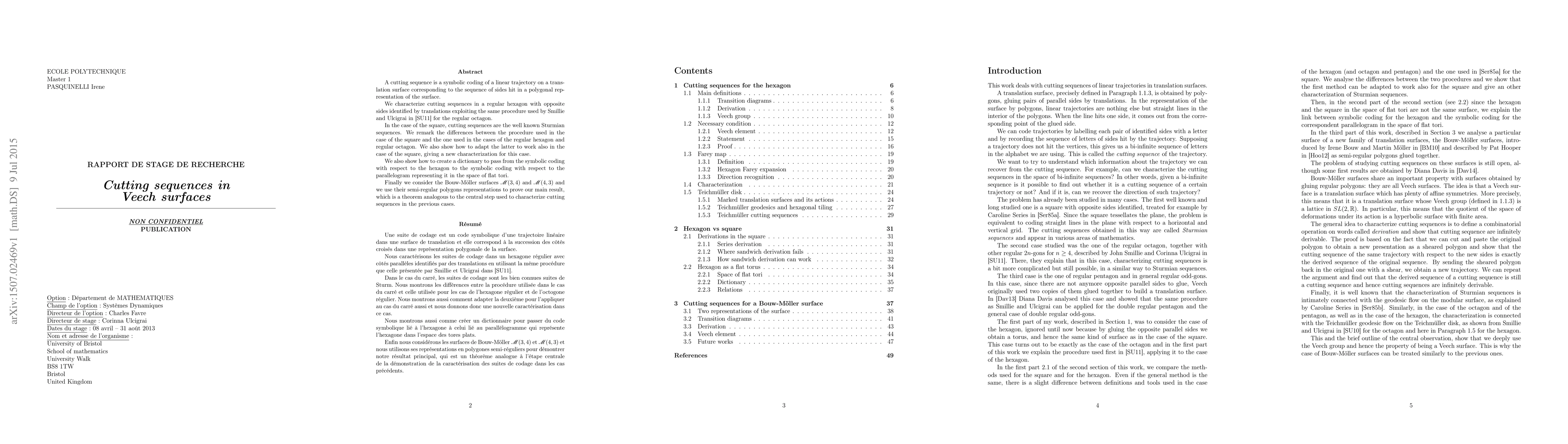 This paper characterizes cutting sequences on Veech surfaces, specifically focusing on regular hexagons and octagons, and explores their adaptation to square surfaces. It introduces a new method to translate symbolic coding between hexagon and parallelogram representations, and extends the results to Bouw-Möller surfaces.