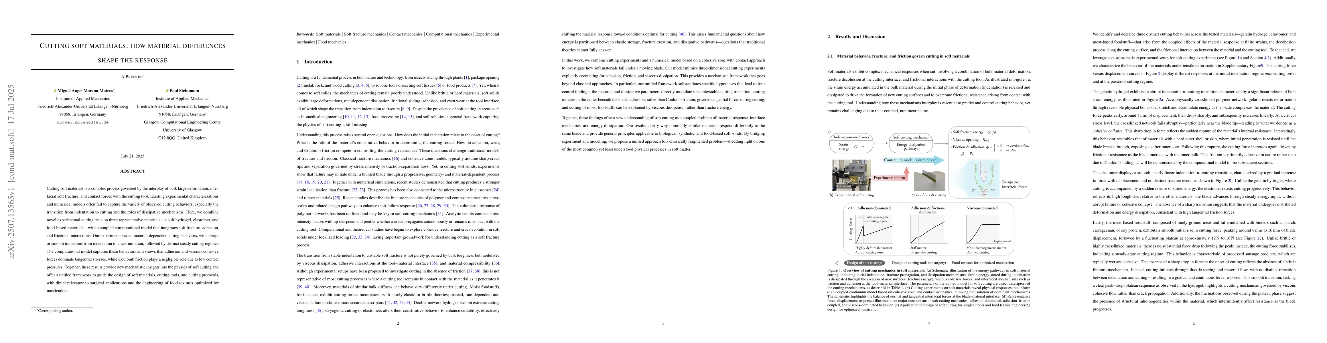 Cutting soft materials is a complex process governed by the interplay of bulk large deformation, interfacial soft fracture, and contact forces with the cutting tool. Existing experimental characterizations and numerical models often fail to capture the variety of observed cutting behaviors, especially the transition from indentation to cutting and the roles of dissipative mechanisms. Here, we combine novel experimental cutting tests on three representative materials-a soft hydrogel, elastomer, and food-based materials-with a coupled computational model that integrates soft fracture, adhesion, and frictional interactions. Our experiments reveal material-dependent cutting behaviors, with abrupt or smooth transitions from indentation to crack initiation, followed by distinct steady cutting regimes. The computational model captures these behaviors and shows that adhesion and viscous cohesive forces dominate tangential stresses, while Coulomb friction plays a negligible role due to low contact pressures. Together, these results provide new mechanistic insights into the physics of soft cutting and offer a unified framework to guide the design of soft materials, cutting tools, and cutting protocols, with direct relevance to surgical applications and the engineering of food textures optimized for mastication.