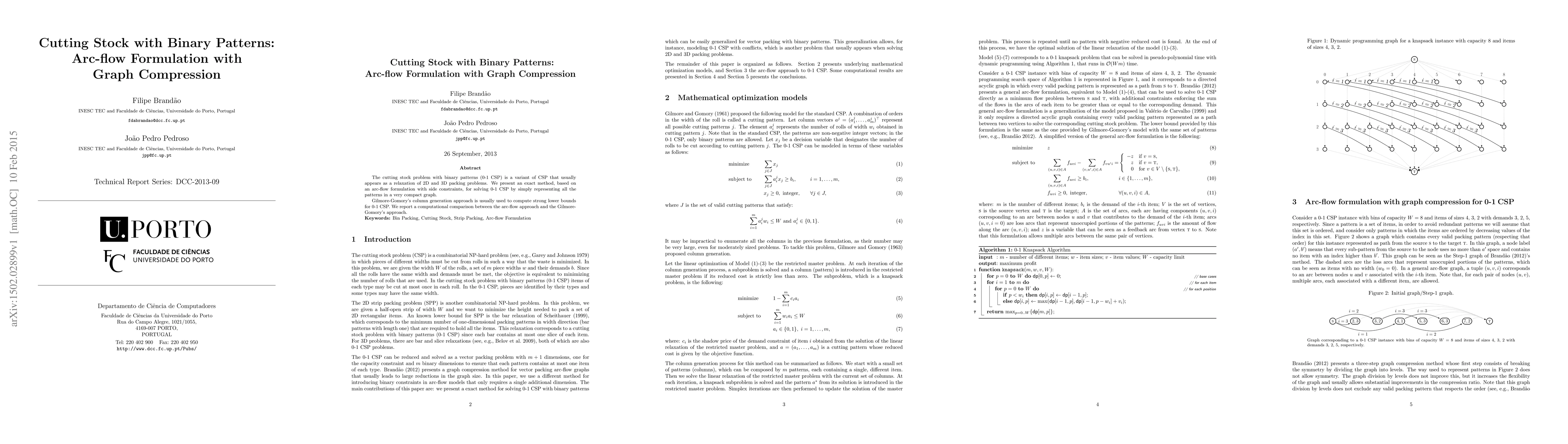 The cutting stock problem with binary patterns (0-1 CSP) is a variant of CSP that usually appears as a relaxation of 2D and 3D packing problems. We present an exact method, based on an arc-flow formulation with side constraints, for solving 0-1 CSP by simply representing all the patterns in a very compact graph. Gilmore-Gomory's column generation approach is usually used to compute strong lower bounds for 0-1 CSP. We report a computational comparison between the arc-flow approach and the Gilmore-Gomory's approach.