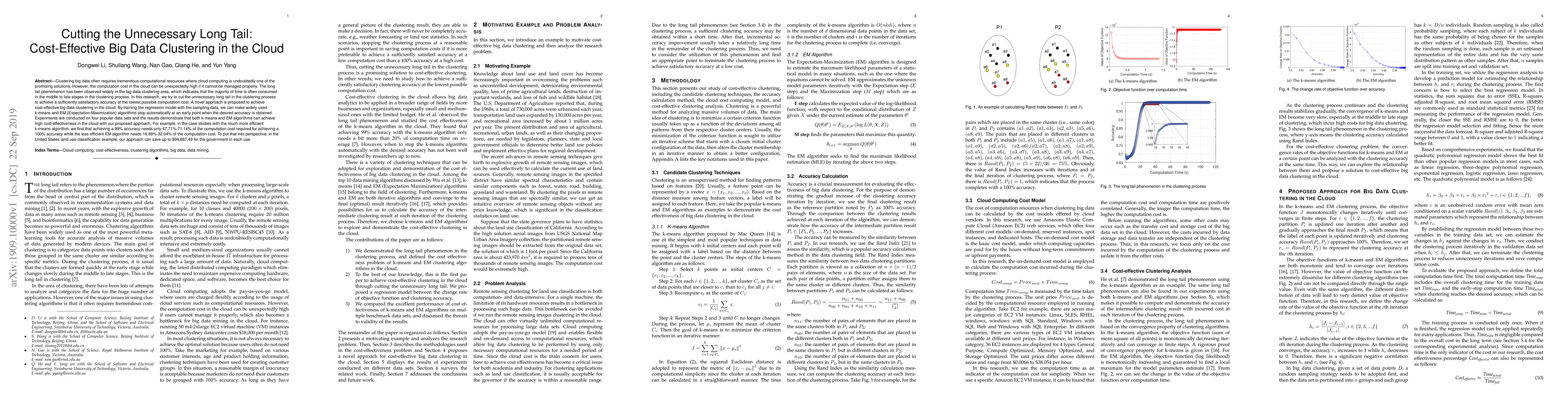 Clustering big data often requires tremendous computational resources where cloud computing is undoubtedly one of the promising solutions. However, the computation cost in the cloud can be unexpectedly high if it cannot be managed properly. The long tail phenomenon has been observed widely in the big data clustering area, which indicates that the majority of time is often consumed in the middle to late stages in the clustering process. In this research, we try to cut the unnecessary long tail in the clustering process to achieve a sufficiently satisfactory accuracy at the lowest possible computation cost. A novel approach is proposed to achieve cost-effective big data clustering in the cloud. By training the regression model with the sampling data, we can make widely used k-means and EM (Expectation-Maximization) algorithms stop automatically at an early point when the desired accuracy is obtained. Experiments are conducted on four popular data sets and the results demonstrate that both k-means and EM algorithms can achieve high cost-effectiveness in the cloud with our proposed approach. For example, in the case studies with the much more efficient k-means algorithm, we find that achieving a 99% accuracy needs only 47.71%-71.14% of the computation cost required for achieving a 100% accuracy while the less efficient EM algorithm needs 16.69%-32.04% of the computation cost. To put that into perspective, in the United States land use classification example, our approach can save up to $94,687.49 for the government in each use.
