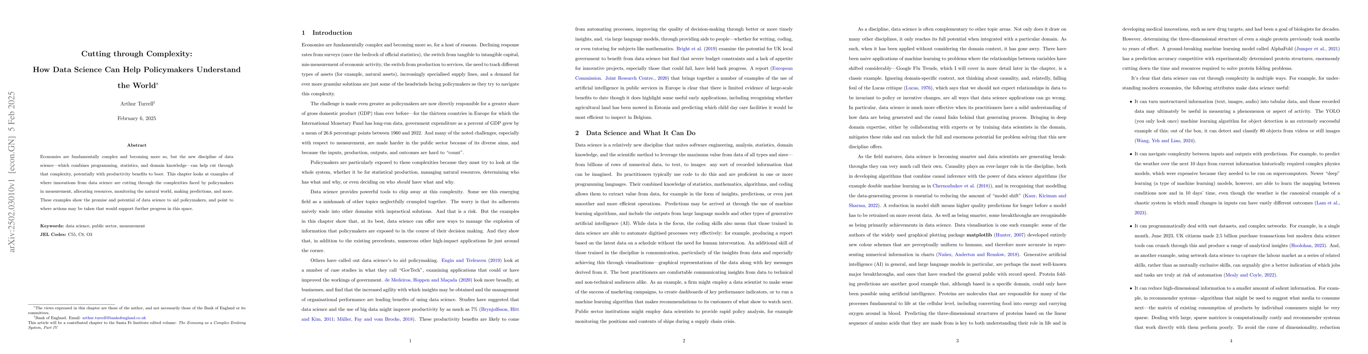 Economies are fundamentally complex and becoming more so, but the new discipline of data science-which combines programming, statistics, and domain knowledge-can help cut through that complexity, potentially with productivity benefits to boot. This chapter looks at examples of where innovations from data science are cutting through the complexities faced by policymakers in measurement, allocating resources, monitoring the natural world, making predictions, and more. These examples show the promise and potential of data science to aid policymakers, and point to where actions may be taken that would support further progress in this space.