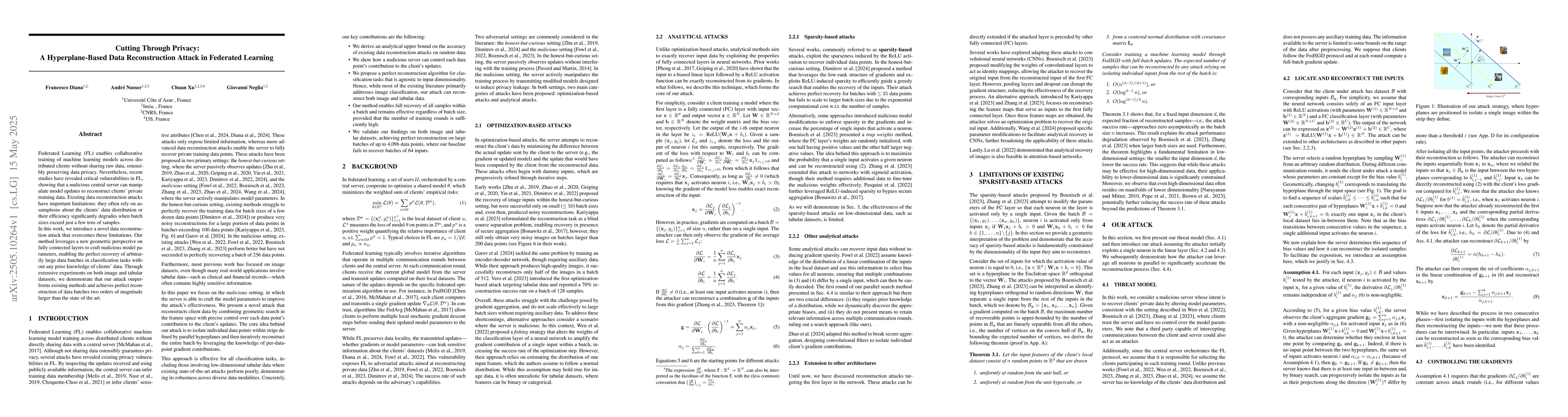 The research introduces a novel data reconstruction attack in Federated Learning that leverages a geometric perspective on fully connected layers to craft malicious model parameters, enabling perfect recovery of arbitrarily large data batches.