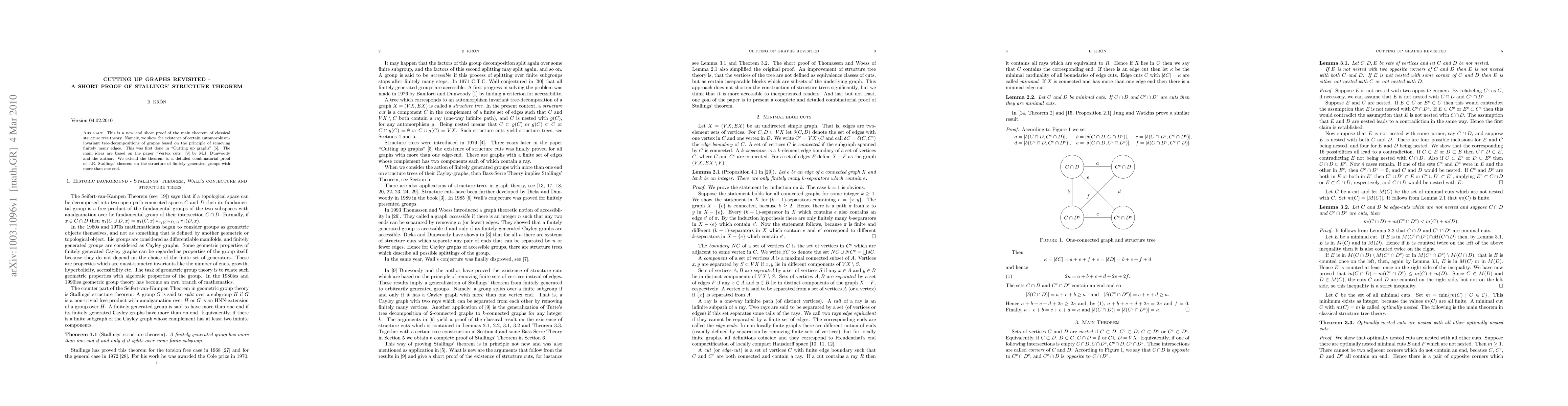 This is a new and short proof of the main theorem of classical structure tree theory. Namely, we show the existence of certain automorphism-invariant tree-decompositions of graphs based on the principle of removing finitely many edges. This was first done in "Cutting up graphs" by M.J. Dunwoody. The main ideas are based on the paper "Vertex cuts" by M.J. Dunwoody and the author. We extend the theorem to a detailed combinatorial proof of J.R. Stallings' theorem on the structure of finitely generated groups with more than one end.