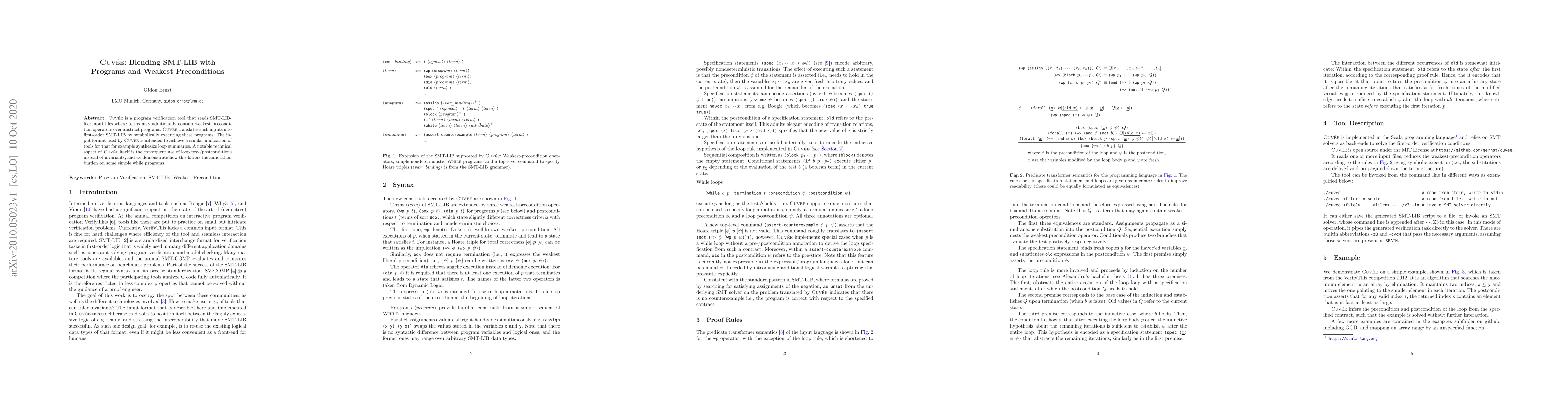 Cuv\'ee is a program verification tool that integrates SMT-LIB inputs with weakest preconditions over abstract programs, translating them into first-order SMT-LIB. It notably uses loop pre-/postconditions instead of invariants, reducing annotation effort for simple while loops.