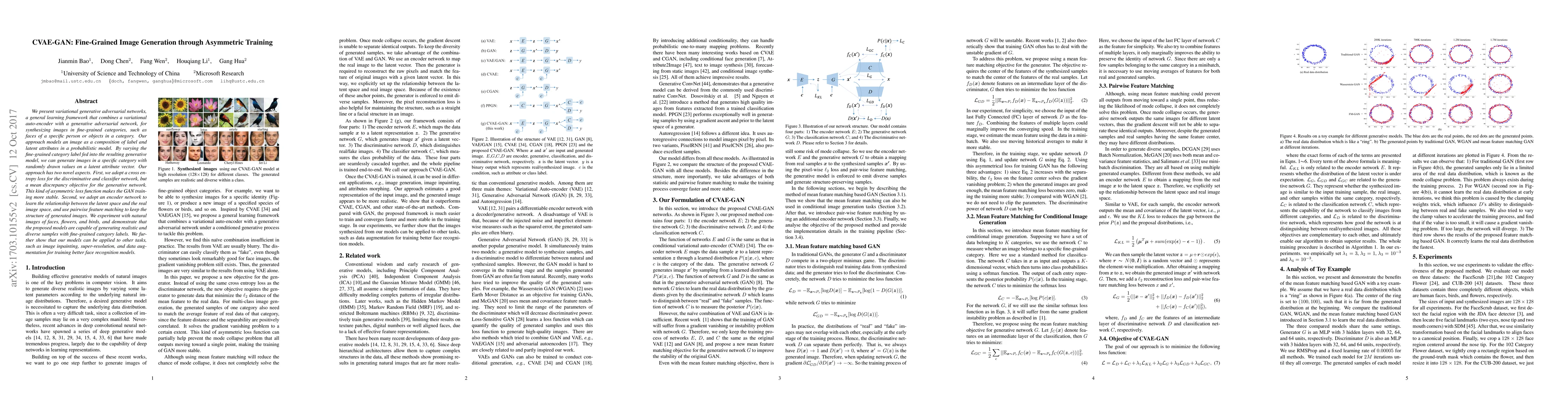The CVAE-GAN framework combines a variational auto-encoder with a generative adversarial network to generate fine-grained images, employing asymmetric training losses to improve stability. The approach uses pairwise feature matching to maintain image structure and demonstrates effectiveness in tasks like image inpainting and super-resolution.