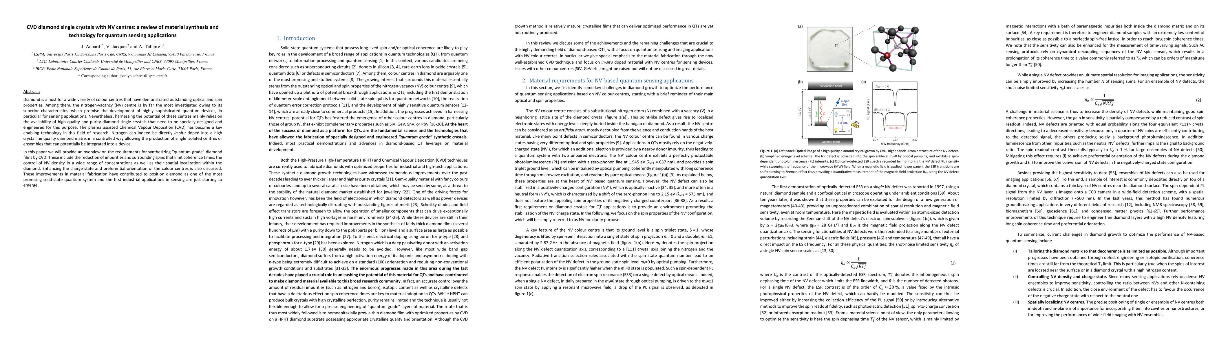 This paper reviews the synthesis and technology of CVD diamond single crystals doped with NV centres, focusing on methods to enhance material quality for quantum sensing applications. Key topics include impurity reduction, NV centre density control, spatial localization, and charge state optimization to develop sophisticated quantum devices.