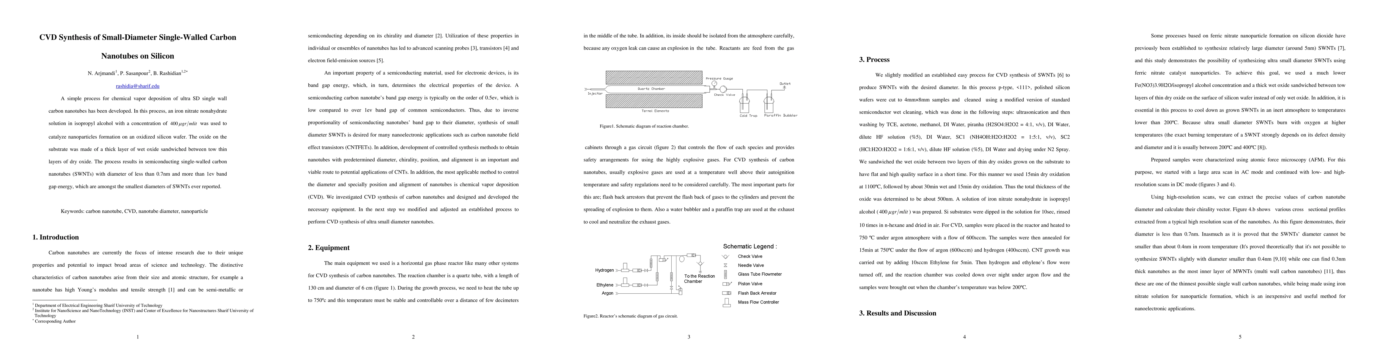 The paper presents a CVD method for synthesizing ultra-small diameter semiconducting single-walled carbon nanotubes (SWNTs) using iron nitrate catalyzed nanoparticles on oxidized silicon, achieving diameters below 0.7 nm and a band gap energy greater than 1 eV. These SWNTs are amongst the smallest reported to date.
