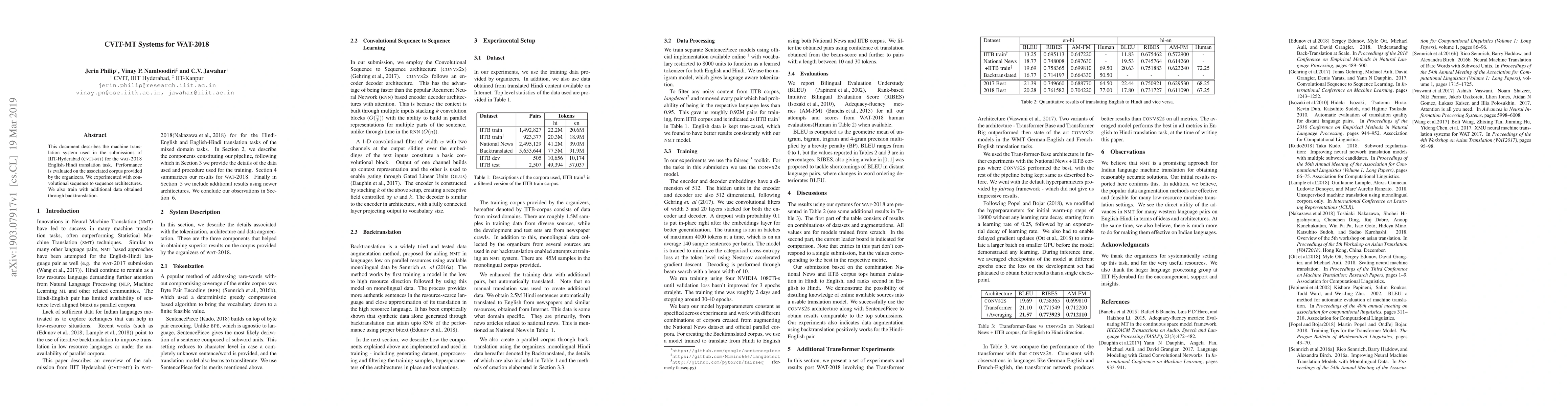This document describes the machine translation system used in the submissions of IIIT-Hyderabad CVIT-MT for the WAT-2018 English-Hindi translation task. Performance is evaluated on the associated corpus provided by the organizers. We experimented with convolutional sequence to sequence architectures. We also train with additional data obtained through backtranslation.