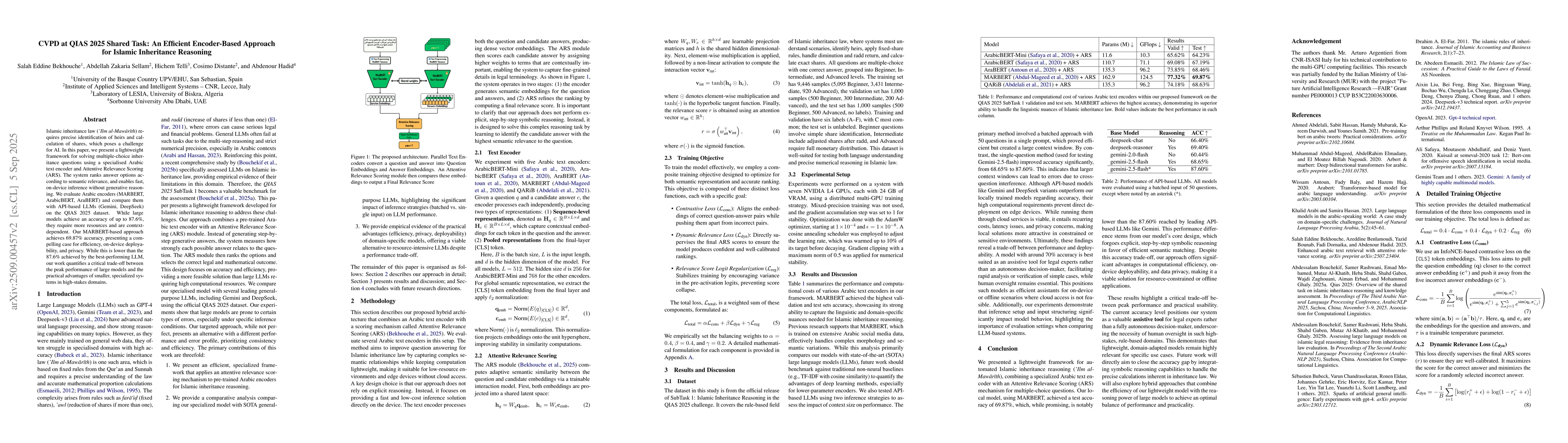 Islamic inheritance law (Ilm al-Mawarith) requires precise identification of heirs and calculation of shares, which poses a challenge for AI. In this paper, we present a lightweight framework for solving multiple-choice inheritance questions using a specialised Arabic text encoder and Attentive Relevance Scoring (ARS). The system ranks answer options according to semantic relevance, and enables fast, on-device inference without generative reasoning. We evaluate Arabic encoders (MARBERT, ArabicBERT, AraBERT) and compare them with API-based LLMs (Gemini, DeepSeek) on the QIAS 2025 dataset. While large models achieve an accuracy of up to 87.6%, they require more resources and are context-dependent. Our MARBERT-based approach achieves 69.87% accuracy, presenting a compelling case for efficiency, on-device deployability, and privacy. While this is lower than the 87.6% achieved by the best-performing LLM, our work quantifies a critical trade-off between the peak performance of large models and the practical advantages of smaller, specialized systems in high-stakes domains.