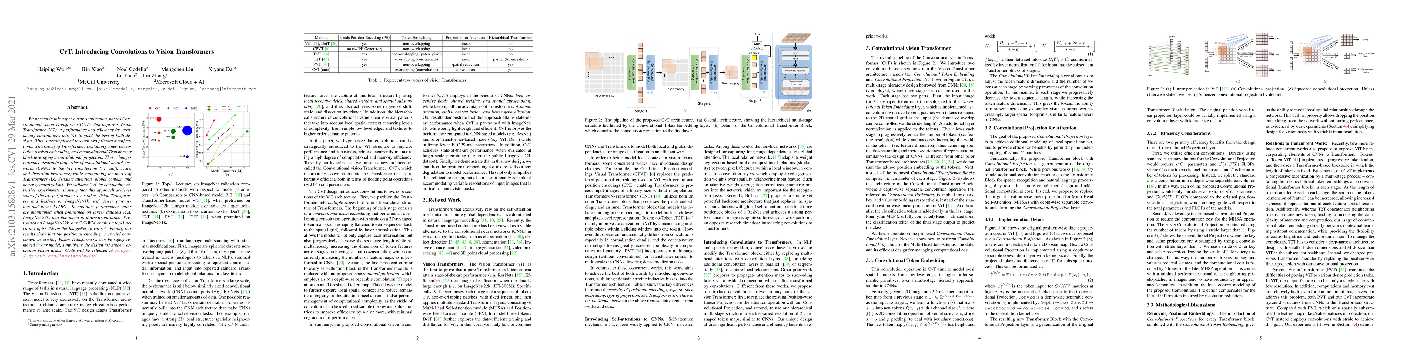 We present in this paper a new architecture, named Convolutional vision Transformer (CvT), that improves Vision Transformer (ViT) in performance and efficiency by introducing convolutions into ViT to yield the best of both designs. This is accomplished through two primary modifications: a hierarchy of Transformers containing a new convolutional token embedding, and a convolutional Transformer block leveraging a convolutional projection. These changes introduce desirable properties of convolutional neural networks (CNNs) to the ViT architecture (\ie shift, scale, and distortion invariance) while maintaining the merits of Transformers (\ie dynamic attention, global context, and better generalization). We validate CvT by conducting extensive experiments, showing that this approach achieves state-of-the-art performance over other Vision Transformers and ResNets on ImageNet-1k, with fewer parameters and lower FLOPs. In addition, performance gains are maintained when pretrained on larger datasets (\eg ImageNet-22k) and fine-tuned to downstream tasks. Pre-trained on ImageNet-22k, our CvT-W24 obtains a top-1 accuracy of 87.7\% on the ImageNet-1k val set. Finally, our results show that the positional encoding, a crucial component in existing Vision Transformers, can be safely removed in our model, simplifying the design for higher resolution vision tasks. Code will be released at \url{https://github.com/leoxiaobin/CvT}.