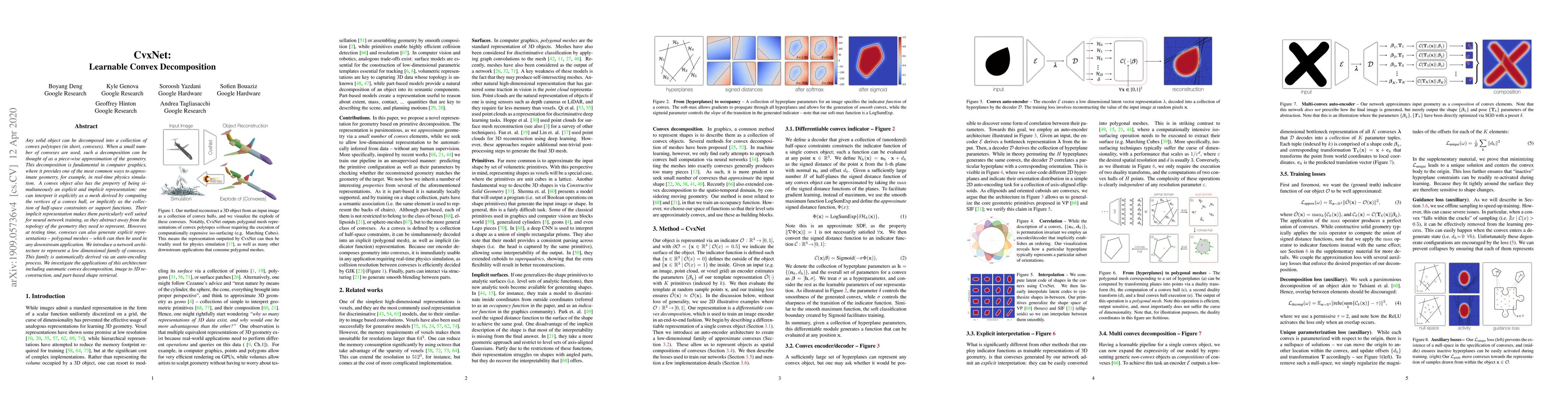 Any solid object can be decomposed into a collection of convex polytopes (in short, convexes). When a small number of convexes are used, such a decomposition can be thought of as a piece-wise approximation of the geometry. This decomposition is fundamental in computer graphics, where it provides one of the most common ways to approximate geometry, for example, in real-time physics simulation. A convex object also has the property of being simultaneously an explicit and implicit representation: one can interpret it explicitly as a mesh derived by computing the vertices of a convex hull, or implicitly as the collection of half-space constraints or support functions. Their implicit representation makes them particularly well suited for neural network training, as they abstract away from the topology of the geometry they need to represent. However, at testing time, convexes can also generate explicit representations -- polygonal meshes -- which can then be used in any downstream application. We introduce a network architecture to represent a low dimensional family of convexes. This family is automatically derived via an auto-encoding process. We investigate the applications of this architecture including automatic convex decomposition, image to 3D reconstruction, and part-based shape retrieval.