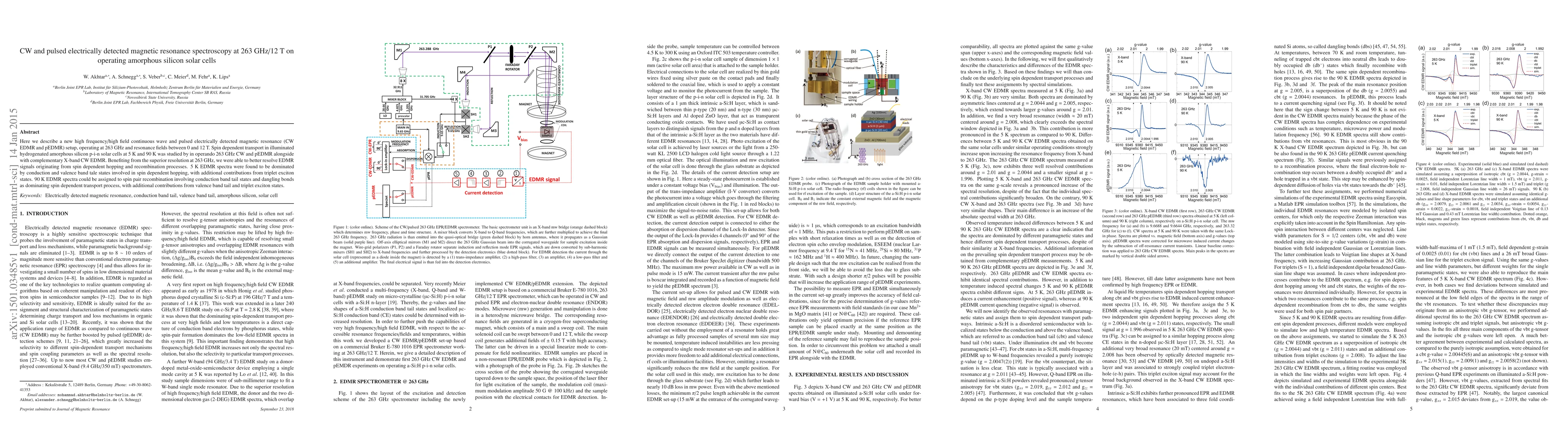 This paper introduces a high-frequency/high-field CW and pulsed electrically detected magnetic resonance setup at 263 GHz, used to study spin-dependent transport in amorphous silicon solar cells. The superior resolution enabled better resolution of EDMR signals, revealing distinct spin-dependent processes at 5 K and 90 K.