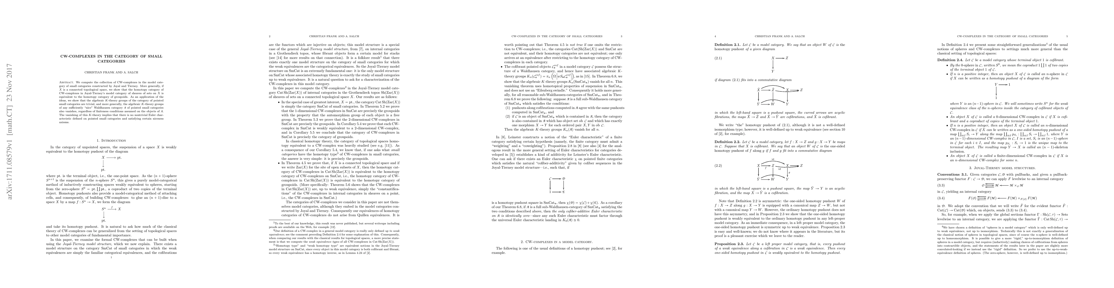 We compute the collection of CW-complexes in the model category of small categories constructed by Joyal and Tierney. More generally, if $X$ is a connected topological space, we show that the homotopy category of CW-complexes in Joyal-Tierney's model category of sheaves of sets on $X$ is equivalent to the homotopy category of groupoids. As an application of the ideas, we show that the algebraic $K$-theory groups of the category of pointed small categories are trivial, and more generally, the algebraic $K$-theory groups of any sufficiently "nice" Waldhausen category $\mathcal{A}$ of pointed small categories also vanishes, regardless of finiteness conditions assumed on the objects of $\mathcal{A}$. The vanishing of this $K$-theory implies that there is no nontrivial Euler characteristic defined on pointed small categories and satisfying certain niceness axioms.