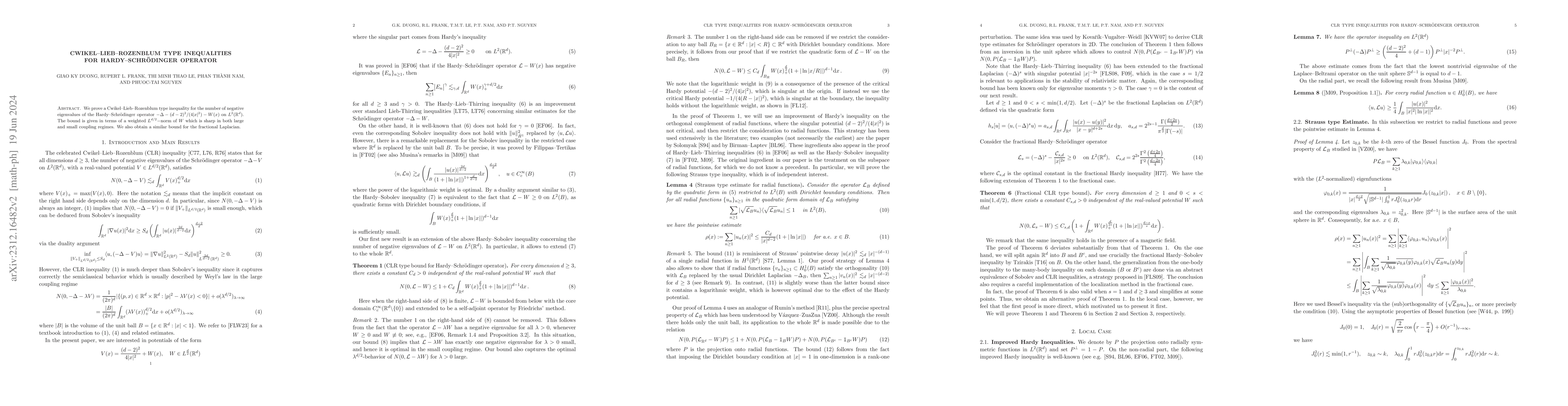 The paper proves a Cwikel-Lieb-Rozenblum inequality for the Hardy-Schr\"odinger operator, relating the number of its negative eigenvalues to a weighted $L^{d/2}$-norm of the potential function $W$, with the bound being sharp. A similar result is obtained for the fractional Laplacian.