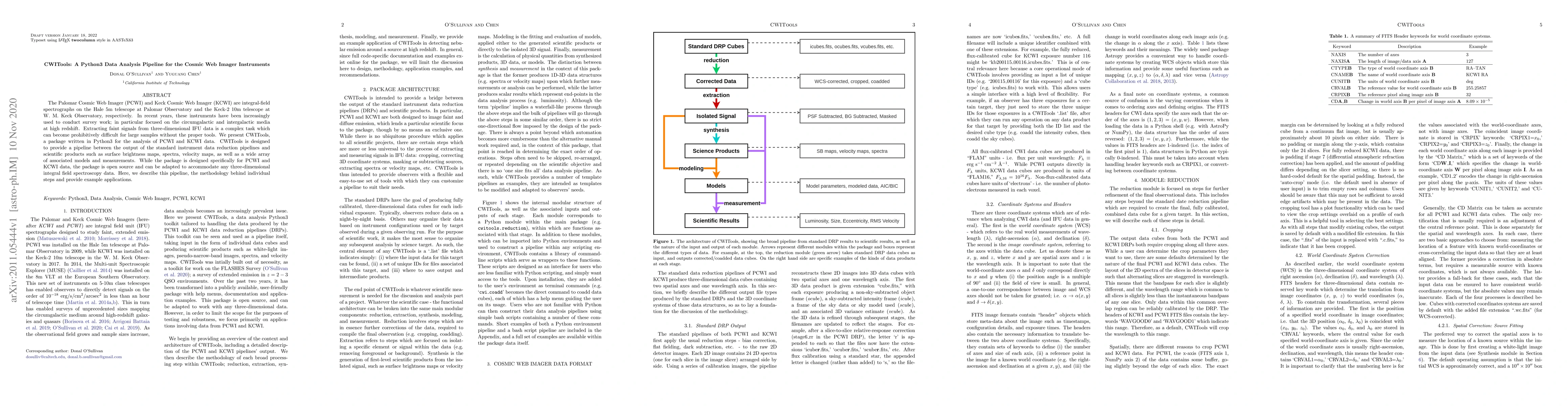 CWITools is a Python3-based data analysis pipeline designed for the Palomar and Keck Cosmic Web Imager instruments, facilitating the extraction of scientific data from their three-dimensional IFU outputs. It aims to streamline the analysis process for large survey datasets, providing tools for generating surface brightness maps, spectra, and velocity maps.