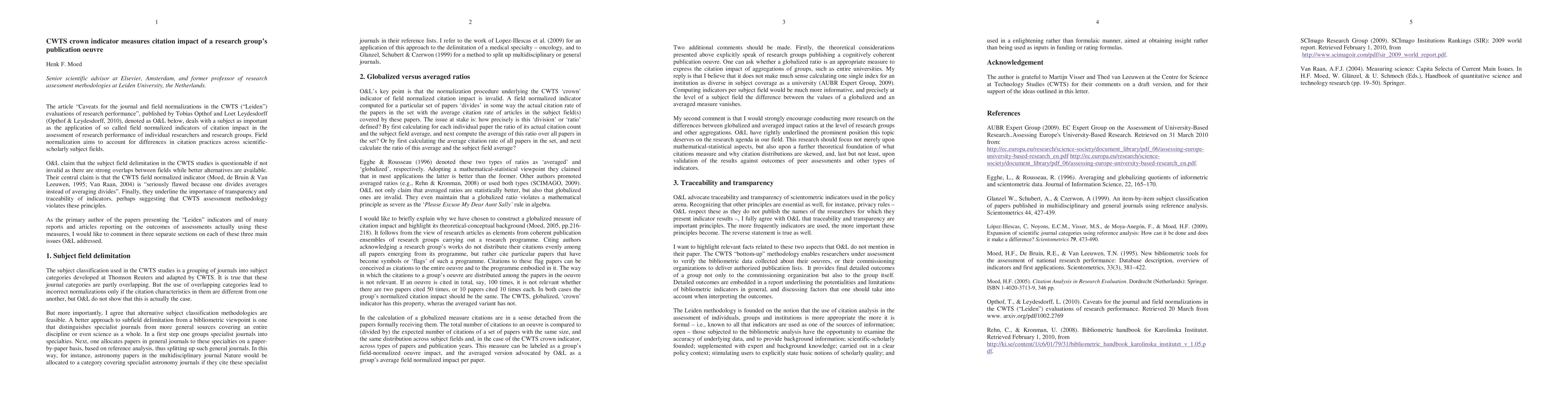 The article "Caveats for the journal and field normalizations in the CWTS (`Leiden') evaluations of research performance", published by Tobias Opthof and Loet Leydesdorff (arXiv:1002.2769) deals with a subject as important as the application of so called field normalized indicators of citation impact in the assessment of research performance of individual researchers and research groups. Field normalization aims to account for differences in citation practices across scientific-scholarly subject fields. As the primary author of the papers presenting the "Leiden" indicators and of many reports and articles reporting on the outcomes of assessments actually using these measures, I comment on the 3 main issues addressed in the paper by Opthof and Leydesdorff.