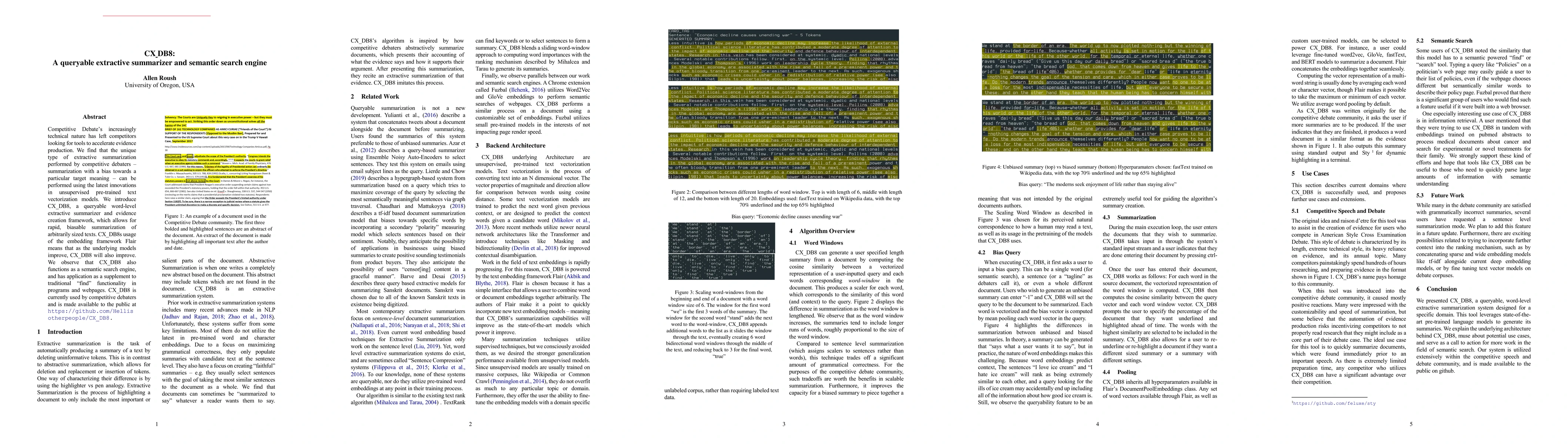 The paper introduces CX_DB8, a tool using unsupervised pre-trained text vectorization models for biased extractive summarization, beneficial for competitive debaters. It also serves as a semantic search engine, enhancing traditional search functionalities.