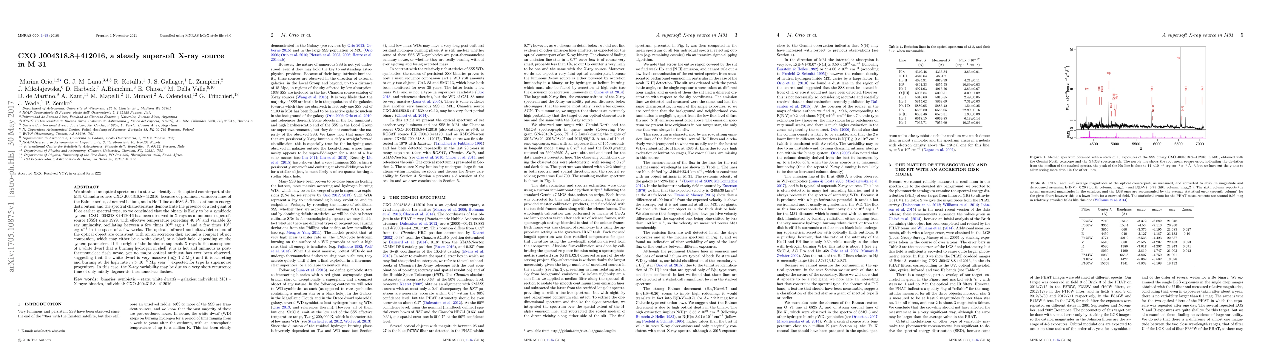 We obtained an optical spectrum of a star we identify as the optical counterpart of the M31 Chandra source CXO J004318.8+412016, because of prominent emission lines of the Balmer series, of neutral helium, and a He II line at 4686 Angstrom. The continuum energy distribution and the spectral characteristics demonstrate the presence of a red giant of K or earlier spectral type, so we concluded that the binary is likely to be a symbiotic system. CXO J004318.8+412016 has been observed in X-rays as a luminous supersoft source (SSS) since 1979, with effective temperature exceeding 40 eV and variable X-ray luminosity, oscillating between a few times 10(35) erg/s and a few times 10(37) erg/s. The optical, infrared and ultraviolet colors of the optical object are consistent with an an accretion disk around a compact object companion, which may either be a white dwarf, or a black hole, depending on the system parameters. If the origin of the luminous supersoft X-rays is the atmosphere of a white dwarf that is burning hydrogen in shell, it is as hot and luminous as post-thermonuclear flash novae, yet no major optical outburst has ever been observed, suggesting that the white dwarf is very massive (m>1.2 M(sol)) and it is accreting and burning at the high rate (mdot>10(-8)M(sol)/year) expected for type Ia supernovae progenitors. In this case, the X-ray variability may be due to a very short recurrence time of only mildly degenerate thermonuclear flashes.