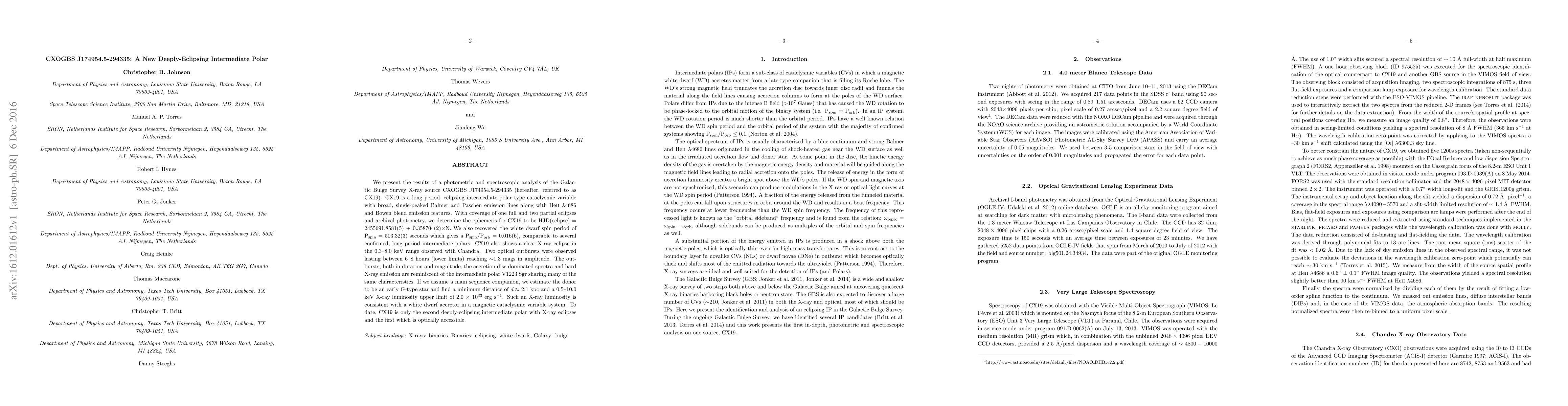 We present the results of a photometric and spectroscopic analysis of the Galactic Bulge Survey X-ray source CXOGBS J174954.5-294335 (hereafter, referred to as CX19). CX19 is a long period, eclipsing intermediate polar type cataclysmic variable with broad, single-peaked Balmer and Paschen emission lines along with HeII $\lambda4686$ and Bowen blend emission features. With coverage of one full and two partial eclipses and archival photometry, we determine the ephemeris for CX19 to be HJD(eclipse) = 2455691.8581(5) + 0.358704(2)$\times$N. We also recovered the white dwarf spin period of P$_{\rm spin}$ = 503.32(3) seconds which gives a P$_{\rm spin}$/P$_{\rm orb}$ = 0.016(6), comparable to several confirmed, long period intermediate polars. CX19 also shows a clear X-ray eclipse in the 0.3-8.0 keV range observed with Chandra. Two optical outbursts were observed lasting between 6-8 hours (lower limits) reaching $\sim$1.3 mags in amplitude. The outbursts, both in duration and magnitude, the accretion disc dominated spectra and hard X-ray emission are reminiscent of the intermediate polar V1223 Sgr sharing many of the same characteristics. If we assume a main sequence companion, we estimate the donor to be an early G-type star and find a minimum distance of $d \approx$ 2.1 kpc and a 0.5-10.0 keV X-ray luminosity upper limit of 2.0 $\times$ 10$^{33}$ erg s$^{-1}$. Such an X-ray luminosity is consistent with a white dwarf accretor in a magnetic cataclysmic variable system. To date, CX19 is only the second deeply-eclipsing intermediate polar with X-ray eclipses and the first which is optically accessible.