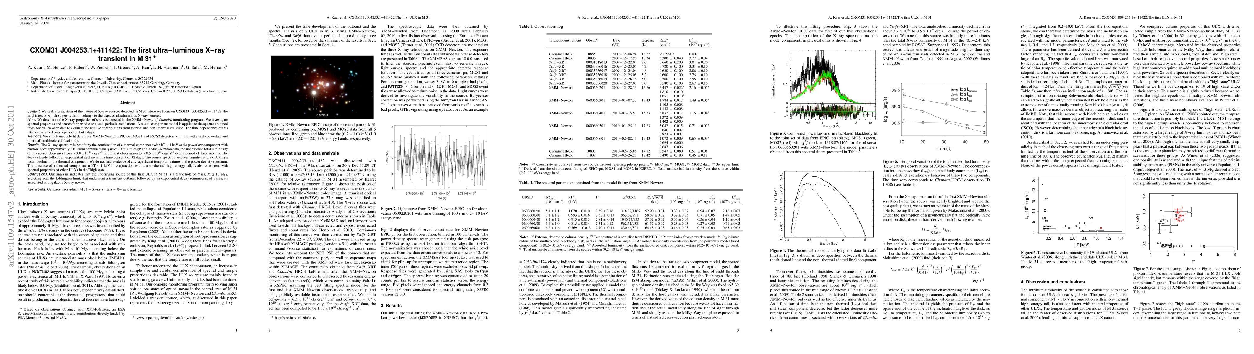 We seek clarification of the nature of X-ray sources detected in M 31. Here we focus on CXOM31 J004253.1+411422, the brightness of which suggests that it belongs to the class of ultraluminous X-ray sources. We determine the X-ray properties of sources detected in the XMM-Newton Chandra monitoring program. We investigate spectral properties and search for periodic or quasi-periodic oscillations. A multi-component model is applied to the spectra obtained from XMM-Newton data to evaluate the relative contributions from thermal and non-thermal emission. The time dependence of this ratio is evaluated over a period of forty days. We simultaneously fit data from XMM-Newton EPIC-pn, MOS1 and MOS2 detectors with (non-thermal) powerlaw and (thermal) multicolored blackbody. The X-ray spectrum is best fit by the combination of a thermal component with kT ~ 1 keV and a powerlaw component with photon index approximately 2.6. From combined analysis of Chandra, Swift and XMM-Newton data, the unabsorbed total luminosity of this source decreases from ~ 3.8 x 10^{39} erg s^{-1} in the first observation to ~ 0.5 x 10^{39} ergs s^{-1} over a period of three months. The decay closely follows an exponential decline with a time constant of 32 days. The source spectrum evolves significantly, exhibiting a faster decline of the thermal component. We do not find evidence of any significant temporal features in the power density spectrum. The presence of a thermal component at kT ~ 1 keV in conjunction with a non-thermal high energy tail, is also consistent with spectral properties of other ULXs in the "high state". Our analysis indicates that the underlying source of this first ULX in M~31 is a black hole of mass, M > 13 M_{sun}, accreting near the Eddington limit, that underwent a transient outburst followed by an exponential decay reminiscent of transients associated with galactic X-ray novae.