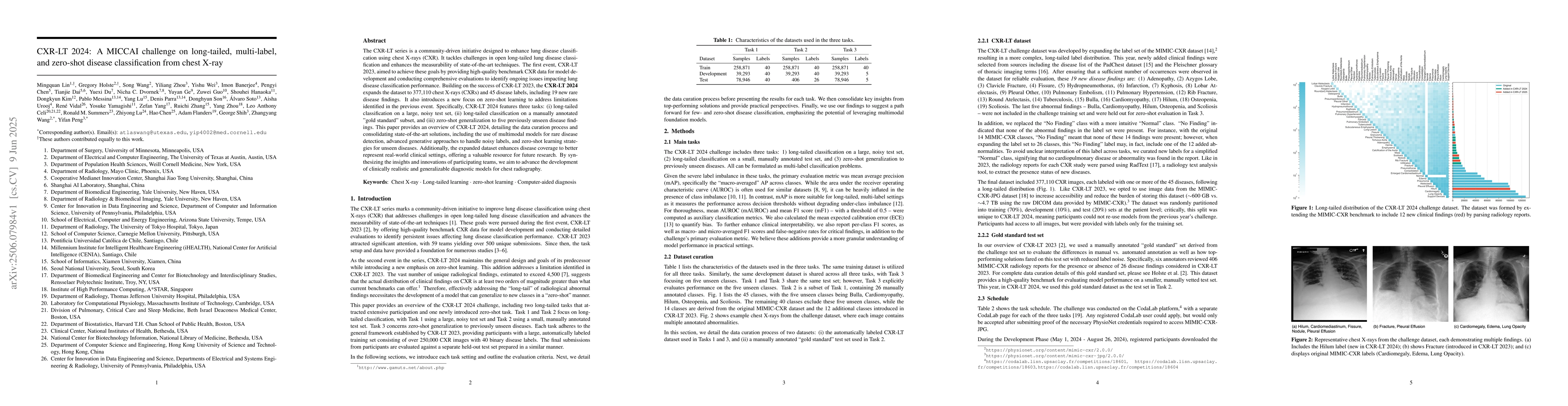 A new dataset of 377,110 chest X-rays with 45 disease labels is released to improve lung disease classification, featuring long-tailed classification and zero-shot learning tasks.