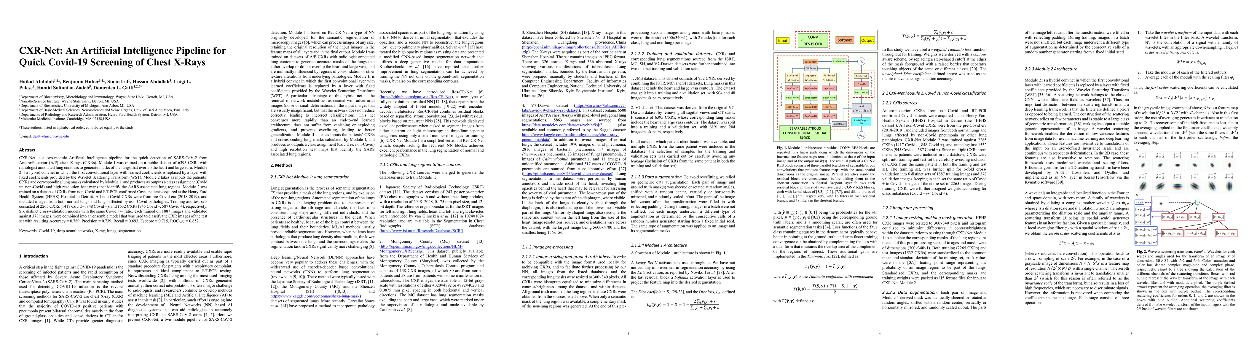CXR-Net is an AI pipeline with two modules for rapid Covid-19 detection from chest X-rays, achieving an accuracy of 78.9% and an AUC of 0.852. It uses lung masks generated from the first module as inputs to a hybrid convolutional network in the second module for final classification.