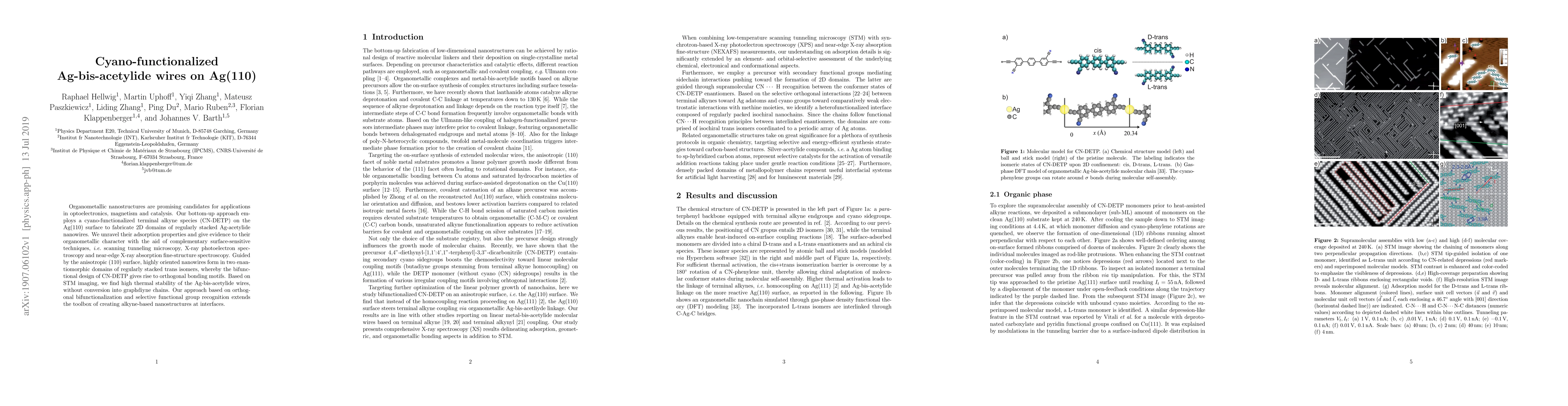 Organometallic nanostructures are promising candidates for applications in optoelectronics, magnetism and catalysis. Our bottom-up approach employs a cyano-functionalized terminal alkyne species (CN-DETP) on the Ag(110) surface to fabricate 2D domains of regularly stacked Ag-acetylide nanowires. We unravel their adsorption properties and give evidence to their organometallic character with the aid of complementary surface-sensitive techniques, i.e. scanning tunneling microscopy, X-ray photoelectron spectroscopy and near-edge X-ray absorption fine-structure spectroscopy. Guided by the anisotropic (110) surface, highly oriented nanowires form in two enantiomorphic domains of regularly stacked trans isomers, whereby the bifunctional design of CN-DETP gives rise to orthogonal bonding motifs. Based on STM imaging, we find high thermal stability of the Ag-bis-acetylide wires, without conversion into graphdiyne chains. Our approach based on orthogonal bifunctionalization and selective functional group recognition extends the toolbox of creating alkyne-based nanostructures at interfaces.